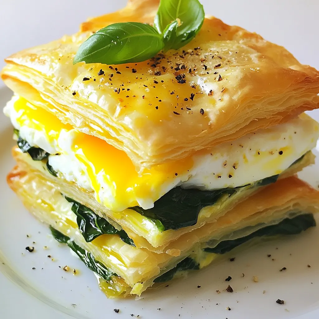 A delightful brunch dish featuring baked eggs layered with spinach and cheese in flaky puff pastry.