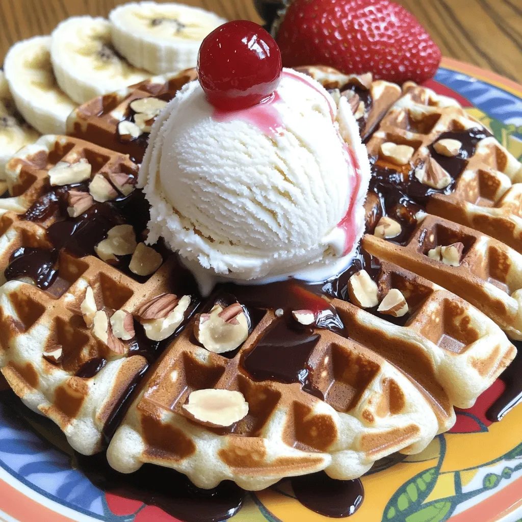![To make these delightful banana split waffles, you need the following main ingredients: - 2 ripe bananas, mashed - 1 cup all-purpose flour - 1 tablespoon sugar - 1 tablespoon baking powder - 1/2 teaspoon salt - 1 cup milk - 1 large egg - 2 tablespoons vegetable oil - 1 teaspoon vanilla extract These ingredients create a fluffy base that holds the flavors well. The ripe bananas add natural sweetness and moisture. Using fresh ingredients ensures the best taste and texture. The fun part of banana split waffles is the toppings. Here are some great options: - Chocolate syrup - Strawberry jam - Whipped cream - Chopped nuts - Maraschino cherries Feel free to mix and match toppings to suit your taste. Each topping adds a different flavor, and you can create your own signature waffle. Banana split waffles are great with a variety of sides. Here are some suggestions: - Fresh fruit like strawberries or blueberries - A scoop of vanilla or chocolate ice cream - A side of crispy bacon for a sweet and salty combo Pairing these waffles with different sides can elevate your breakfast experience. Enjoy these combinations and discover your favorite! For the complete recipe, check the Full Recipe. Start by gathering all your ingredients. You will need ripe bananas, flour, sugar, baking powder, salt, milk, an egg, vegetable oil, and vanilla extract. First, mash the bananas in a large bowl. Use a fork for this task. Next, add the milk, egg, vegetable oil, and vanilla extract. Mix until everything is smooth and well combined. In another bowl, whisk together the flour, sugar, baking powder, and salt. Gradually add this dry mix to the banana mixture. Stir gently until just combined. It’s okay to have some lumps. Preheat your waffle iron according to the instructions. This step is key for crispy waffles. Once hot, lightly grease the iron with cooking spray or oil. Pour about 1/2 cup of batter onto the center of the iron. Close the lid and cook until golden brown. The time will depend on your waffle maker. Carefully remove the waffles once cooked. Repeat this step until all the batter is used. Now it’s time to make your waffles look amazing! Place one waffle on a plate. Add a generous scoop of ice cream on top. Drizzle chocolate syrup and strawberry jam over the ice cream for a sweet touch. Next, add a dollop of whipped cream. Sprinkle chopped nuts on top for some crunch. Finally, finish with a maraschino cherry. This will make your banana split waffles shine! For the full recipe, refer to the earlier section. Enjoy your delightful breakfast! For the best waffles, keep an eye on your batter. Mix it just enough to combine. If you overmix, the waffles can turn out tough. A few lumps are perfectly fine. The secret to fluffy waffles lies in the air pockets. Letting the batter rest for a few minutes helps too. This can make your waffles lighter and more tender. Many people make the mistake of not preheating the waffle iron. Always wait until it is hot before pouring in the batter. Also, don’t use too much batter. About 1/2 cup works well for most irons. If you pour in too much, the waffle can overflow. Lastly, avoid opening the waffle iron too soon. This can cause your waffle to fall apart. Wait until it is golden brown for the best result. Banana split waffles are fun to serve! You can make them a party treat. Offer various toppings, so everyone can customize their own. Set out bowls of whipped cream, chocolate syrup, and sliced bananas. You can even add sprinkles for a festive touch. For a fresh twist, serve with berries or a scoop of yogurt. To impress guests, stack two waffles and create a waffle tower. They will love the look and taste! You can check the Full Recipe for more ideas. {{image_2}} You can change things up by adding more fruit. Try strawberries, blueberries, or peaches. Just chop them up and mix them in. You can also use frozen fruit if fresh is not available. Each fruit brings a new flavor. This keeps your breakfast fun! If you want a lighter version, swap out some ingredients. Use whole wheat flour instead of all-purpose flour. You can also reduce the sugar. Try using honey or maple syrup for sweetness. For a boost of nutrition, add chia seeds or flax seeds to the batter. These changes help you enjoy a healthier treat without losing flavor. Want to make this recipe vegan? Simple! Replace the egg with a flax egg. Mix one tablespoon of ground flaxseed with three tablespoons of water, then let it sit until it thickens. For milk, use almond, oat, or coconut milk. You can also swap the ice cream for a dairy-free version. This way, everyone can enjoy banana split waffles! For the full recipe, check out the guidelines above. To keep your leftover waffles fresh, stack them in an airtight container. Place a piece of parchment paper between each waffle. This step prevents them from sticking together. Store the container in the fridge. They will stay good for about three days. When you’re ready to eat the waffles again, you can reheat them in a few ways. The best method is to use a toaster. This helps them get crispy again. You can also use an oven. Preheat it to 350°F (175°C) and warm the waffles for about 5-10 minutes. Microwaving is quick, but it may make them soft. If you do use the microwave, heat for only 20-30 seconds. If you want to save waffles for later, freezing is a great option. Let the waffles cool completely first. Then, wrap each one in plastic wrap. Place the wrapped waffles in a freezer bag. They can last up to three months in the freezer. When you're ready to enjoy them, thaw in the fridge overnight before reheating. This way, you can have delicious banana split waffles anytime! For the full recipe, check out the main section. A banana split waffle is a fun twist on the classic dessert. It combines a warm waffle with the flavors of a banana split. You start with a fluffy waffle base, then add fresh bananas, ice cream, and toppings. It creates a sweet and delicious breakfast treat.
