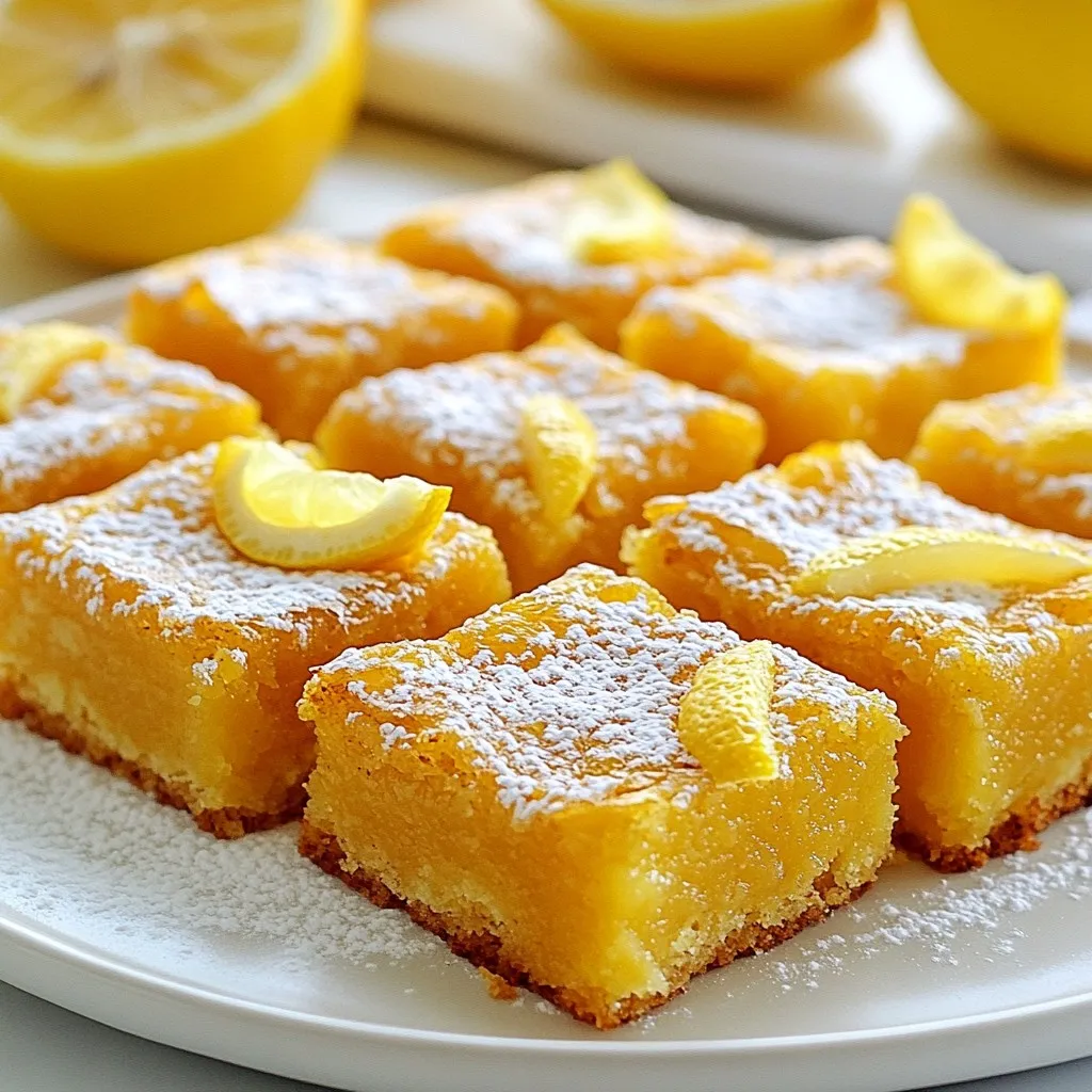 - 1 cup unsalted butter, melted - 1 1/2 cups granulated sugar - 3 large eggs - 1 tablespoon lemon zest (from about 2 lemons) - 1/2 cup fresh lemon juice (about 2 lemons) - 1 teaspoon vanilla extract - 2 cups all-purpose flour - 1/2 teaspoon baking powder - 1/4 teaspoon salt - Powdered sugar for dusting Each ingredient plays a key role in making these brownies shine. - Butter adds richness and moisture. It helps create a tender texture. - Granulated sugar gives sweetness and helps with browning. It makes the top crisp. - Eggs bind the mix and improve texture. They add a nice lift. - Lemon zest brings bright flavor. It makes the brownies taste fresh and zesty. - Fresh lemon juice adds tartness. It balances the sweetness well. - Vanilla extract rounds out the flavors. It adds warmth to the taste. - All-purpose flour provides structure. It holds everything together. - Baking powder helps the brownies rise. It makes them soft and fluffy. - Salt enhances flavors. A little goes a long way. Getting your measurements right is very important. Here are some tips: - Use dry measuring cups for flour and sugar. Fill the cup, then level off with a knife. - For butter, use the stick markings. They show you how much to use. - When measuring liquids, use a clear liquid measuring cup. Check at eye level for accuracy. - For lemon zest and juice, use fresh lemons. They have the best taste. Follow these tips, and your brownies will turn out great! {{ingredient_image_1}} Start by preheating your oven to 350Β°F (175Β°C). While it heats, grab a 9x13-inch baking dish. Grease it well and line it with parchment paper. Leave some paper hanging over the edges. This makes it easy to lift out the brownies later. In a large mixing bowl, add 1 cup of melted unsalted butter and 1 1/2 cups of granulated sugar. Stir them together until they blend well. Let this cool for a few minutes. Next, add 3 large eggs, 1 tablespoon of lemon zest, 1/2 cup of fresh lemon juice, and 1 teaspoon of vanilla extract. Whisk everything until it looks smooth and well mixed. In a separate bowl, take 2 cups of all-purpose flour, 1/2 teaspoon of baking powder, and 1/4 teaspoon of salt. Whisk these dry ingredients until they are combined. Gradually add this mixture to the wet ingredients. Stir gently to mix. Be careful not to overmix; a few lumps are okay. Pour the batter into the prepared baking dish. Spread it out evenly with a spatula. Bake in your preheated oven for 20-25 minutes. Check for doneness by inserting a toothpick into the center. If it comes out clean, the brownies are done. The edges should be lightly golden. Once baked, remove the dish from the oven. Let it cool in the pan for about 15 minutes. Then, use the parchment paper to lift the brownies out. Transfer them to a wire rack to cool completely. After they cool, dust the top with powdered sugar. Cut into squares and enjoy your bright lemon brownies! To get the right texture in your lemon brownies, focus on mixing. You want a soft and chewy brownie, not a cake. Mix the wet and dry ingredients just until they blend. Overmixing can lead to dryness. Also, make sure your butter is melted but not hot. A cooler temperature helps keep the brownies moist. To boost the lemon flavor, use fresh lemon juice and zest. The zest adds a strong, bright taste. You can also add a bit of lemon extract for extra zing. Another tip is to let the batter sit for a few minutes before baking. This resting time allows the flavors to meld and deepen. When serving these lemon brownies, presentation matters. Dust them with powdered sugar for a nice touch. You can also add lemon slices around the plate for color. Consider pairing them with a scoop of vanilla ice cream. The cool ice cream balances the bright lemon flavor and makes for a delightful treat. Pro Tips Use Fresh Ingredients: Always opt for fresh lemons for zest and juice to enhance the flavor of your brownies. Don't Overmix: Mix the wet and dry ingredients just until combined to keep the brownies tender and avoid a dense texture. Cool Completely: Allow the brownies to cool completely before cutting to ensure clean edges and a perfect presentation. Experiment with Toppings: Consider adding a drizzle of lemon glaze or sprinkles of sea salt on top for an added flavor contrast. {{image_2}} You can make your Bright Lemon Brownies even more delightful by adding lemon icing. To make the icing, mix powdered sugar with fresh lemon juice until smooth. Drizzle the icing over the cooled brownies for a sweet and tangy touch. This adds a nice shine and extra lemon flavor. Plus, it looks beautiful on the brownies! If you want to mix things up, try adding other citrus fruits. Orange or lime juice can replace some lemon juice. You can also add zest from these fruits for a new flavor. This twist makes your brownies unique and exciting. Just remember not to overpower the lemon taste. Balance is key! For those who need gluten-free options, there are easy swaps. Use almond flour or a gluten-free all-purpose blend. Be sure to check that your baking powder is gluten-free too. The texture might change slightly, but the taste will still be bright and delicious. Enjoy these brownies without worry! To keep your Bright Lemon Brownies fresh, store them in an airtight container. This helps them stay soft and moist. You can place parchment paper between layers to avoid sticking. Keep the container in a cool, dry place. If your kitchen is warm, consider using the fridge. When stored properly, these brownies can last up to a week. If you keep them in the fridge, they may stay fresh for about ten days. Always check for any signs of spoilage. If they look dry or hard, it’s time to toss them out. You can freeze these delicious brownies for later. First, cut them into squares. Wrap each square tightly in plastic wrap. Then, place the wrapped brownies in a freezer-safe bag. They can stay good for three months in the freezer. When ready to eat, thaw them in the fridge overnight or at 