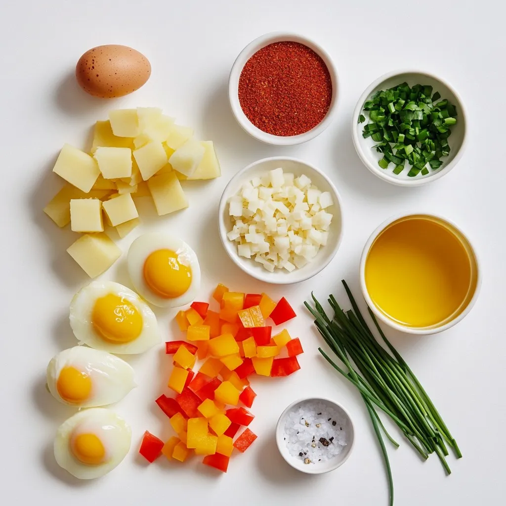 The ingredients for cheesy potato egg scramble are simple yet flavorful. You start with russet potatoes. They are perfect because they hold their shape. Next, you need large eggs. They add richness and protein. Shredded cheddar cheese brings a creamy texture.