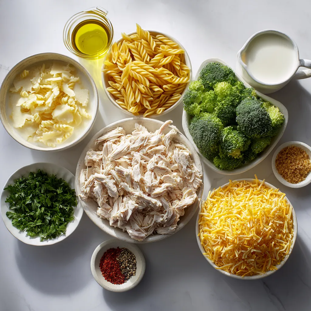For this Chicken and Broccoli Pasta Bake, we need a few key items. First, you will want cooked chicken. You can use leftover chicken or rotisserie chicken for ease. Next, fresh broccoli adds a nice crunch and color. You can use two cups of fresh florets for this recipe.