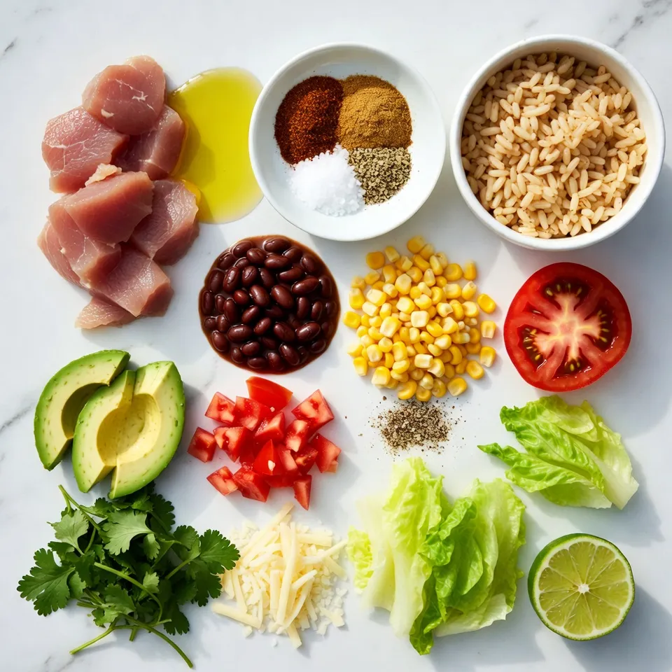 To make tasty chicken burrito bowls, gather these simple ingredients: