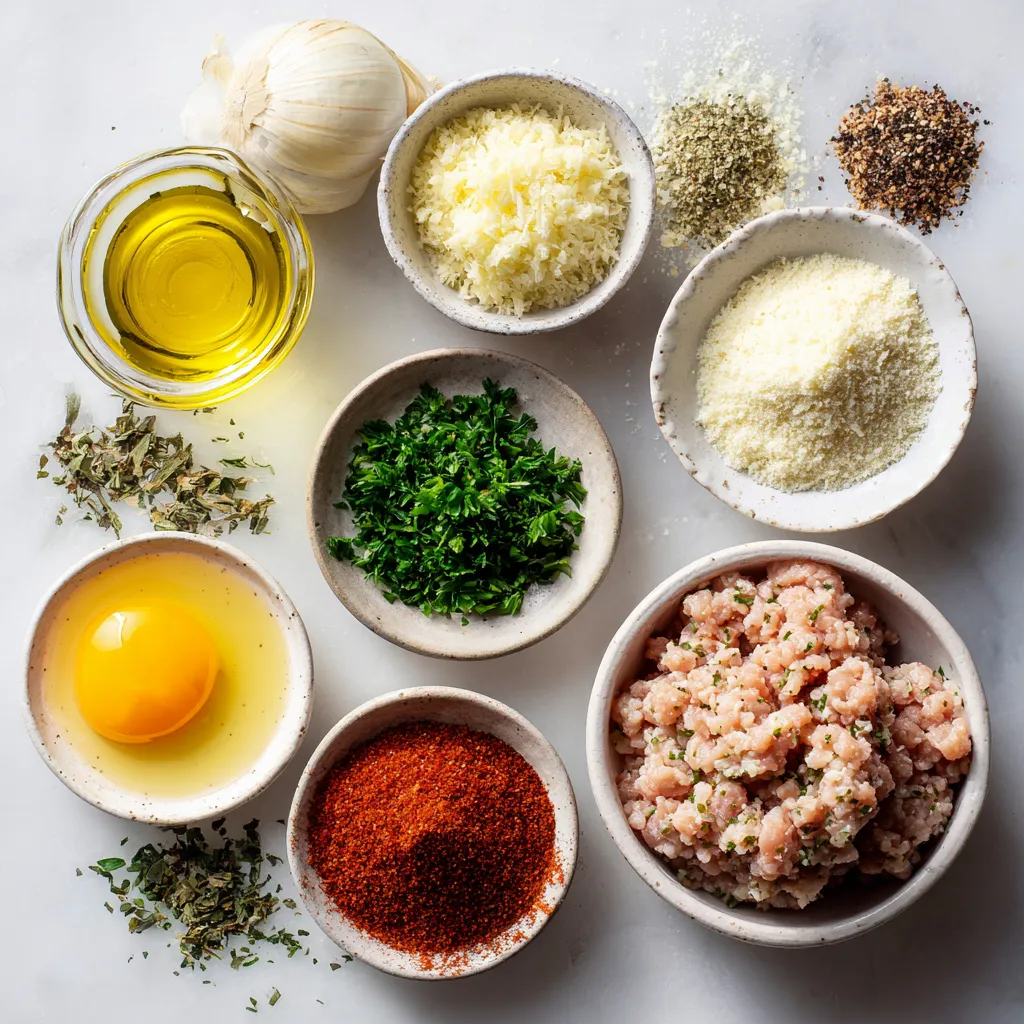 • In a large mixing bowl, combine the ground chicken, chopped onion, minced garlic, breadcrumbs, grated parmesan, parsley, oregano, paprika, salt, black pepper, Dijon mustard, and the beaten egg.