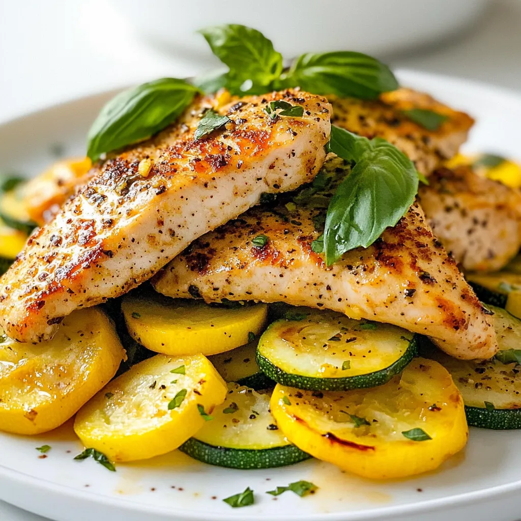To make this Chicken with Zucchini and Squash, you need: - 2 boneless, skinless chicken breasts - 2 medium zucchinis, sliced into half-moons - 2 yellow squashes, sliced into half-moons - 1 red bell pepper, diced - 3 cloves garlic, minced - 1 teaspoon dried thyme - 1 teaspoon smoked paprika - 2 tablespoons olive oil - Salt and pepper to taste - Fresh basil leaves for garnish You can also add these for more taste: - 1 onion, diced - 1 teaspoon Italian seasoning - A splash of lemon juice - Red pepper flakes for heat For this dish, gather the following tools: - A large skillet - A sharp knife - A cutting board - A cooking spoon - A meat thermometer (helpful for checking chicken doneness) This simple list keeps the focus on fresh flavors and easy cooking. Enjoy your meal prep! {{ingredient_image_1}} - Start by seasoning the chicken breasts. - Use salt, pepper, smoked paprika, and dried thyme. - Coat both sides well for great flavor. - Slice zucchinis and yellow squashes into half-moons. - Dice the red bell pepper. - Mince the garlic cloves. - Heat olive oil in a large skillet over medium heat. - Once hot, add the seasoned chicken breasts. - Cook for 5-7 minutes on each side. - Look for a golden brown color and 165°F inside. - Remove the chicken and set it aside. - Add minced garlic to the same skillet. - Sauté for 30 seconds until fragrant. - Add the sliced zucchinis, yellow squash, and bell pepper. - Sauté for 5-7 minutes until veggies are tender but crisp. - Return the chicken to the skillet. - Cook together for an additional 2-3 minutes. - Taste and adjust seasoning if needed. - Add more salt, pepper, or thyme to your liking. - Remove from heat and let it rest for a minute. - Garnish with fresh basil leaves for added flavor. - Serve warm and enjoy your delicious meal! To season chicken well, start with salt and pepper. Sprinkle them on both sides evenly. Then add smoked paprika for a nice smoky flavor. Dried thyme gives it a lovely herbal note. Use your hands to rub the spices in. This way, the flavors stick and deepen. Let the chicken sit for a few minutes to soak up the spices. This simple step makes a big difference in taste. Zucchini and squash cook best when sautéed. This method keeps them crisp and colorful. Heat olive oil in a skillet over medium heat. Add minced garlic first to infuse flavor. Then, toss in the sliced veggies. Cook for about 5-7 minutes, stirring often. You want them tender but still a bit firm. This way, they hold their shape and add a nice crunch. To save time, prep all ingredients before cooking. Slice the zucchini and squash, and dice the bell pepper ahead. Use a sharp knife to make quick work. You can also use pre-minced garlic to cut down on prep time. Cook chicken and veggies in the same skillet. This method reduces dishes and keeps flavors rich. Finally, keep your heat at medium. This helps everything cook evenly without burning. Pro Tips Proper Chicken Preparation: Ensure the chicken breasts are at room temperature before cooking for even cooking and tenderness. Vegetable Crunch: To maintain the crispness of the zucchini and squash, avoid overcooking them. Sauté just until tender. Flavor Infusion: For increased flavor, marinate the chicken in olive oil, garlic, and herbs for at least 30 minutes before cooking. Garnish for Freshness: Always add fresh herbs like basil right before serving to enhance the dish’s aroma and flavor profile. {{image_2}} You can swap chicken breasts for turkey or pork. These meats cook similarly. You can also use tofu for a plant-based option. Just ensure it’s firm enough to hold up in the skillet. Feel free to mix in more veggies. Broccoli, asparagus, or bell peppers add great color. Carrots or snap peas can add crunch. Use whatever you have on hand for a fun twist. Don’t be afraid to try new herbs and spices. Swap thyme for oregano or rosemary for a different flavor. Add chili powder if you like heat. You can even use a squeeze of lemon juice for brightness. After your meal, let the chicken and veggies cool down. Place them in an airtight container. Store the container in the fridge for up to three days. Make sure to keep the chicken and veggies separate if possible. This helps maintain their texture and taste. To reheat, use a skillet over medium heat. Add a splash of olive oil or water. Cook for about five minutes, stirring often. Ensure the chicken reaches an internal temperature of 165°F for safety. You can also use a microwave. Heat for 1-2 minutes, checking often, until warm. For longer storage, freeze the chicken and veggies. Use freezer-safe bags or containers. Remove as much air as possible to prevent freezer burn. Label the bags with the date. You can keep them in the freezer for up to three months. When ready to eat, thaw overnight in the fridge before reheating. Yes, you can use other chicken cuts. Thighs work well, too. They have more flavor and stay moist. Bone-in chicken adds a nice taste but takes longer to cook. If you use chicken wings, adjust cooking time to ensure they cook through. A large skillet is ideal for this dish. A non-stick skillet helps prevent sticking. You can also use a cast-iron pan for great heat distribution. A meat thermometer ensures the chicken is cooked to 165°F. This tool helps you avoid dry chicken. To make this dish vegetarian, swap the chicken for tofu or tempeh. Both options absorb flavors well and add protein. Use the same seasonings for a tasty result. You may also add more veggies, like mushrooms or bell peppers, for extra texture and taste. This blog post covered key ingredients, step-by-step cooking, and helpful tips for preparing a delicious meal. You learned about required and optional ingredients, cooking methods, and storage options. Remember, you can mix and match flavors and vegetables to suit your taste. By keeping these points in mind, you’ll make cooking easy and fun. Try new variations and share your results. Enjoy your meals, and keep experimenting in the