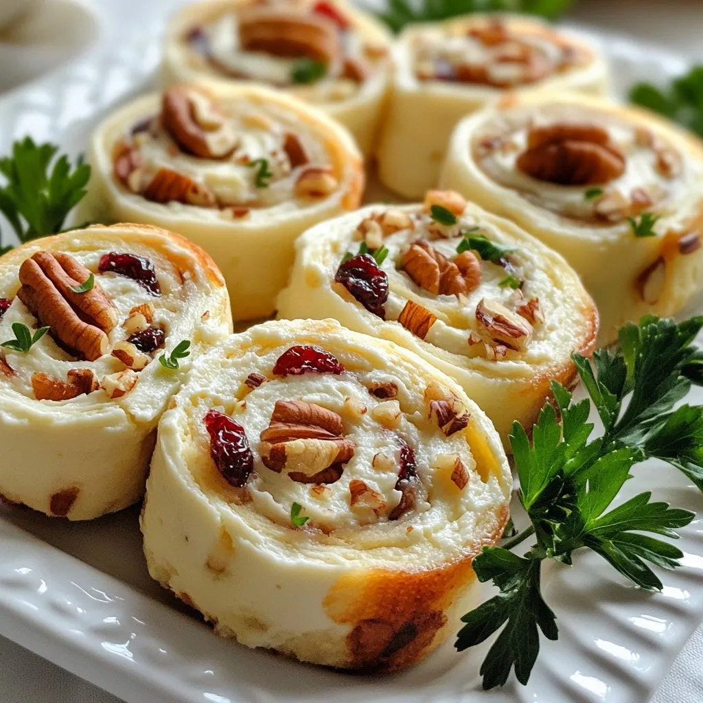 Festive and delicious pinwheels filled with cream cheese, cranberries, and pecans, perfect for holiday gatherings.