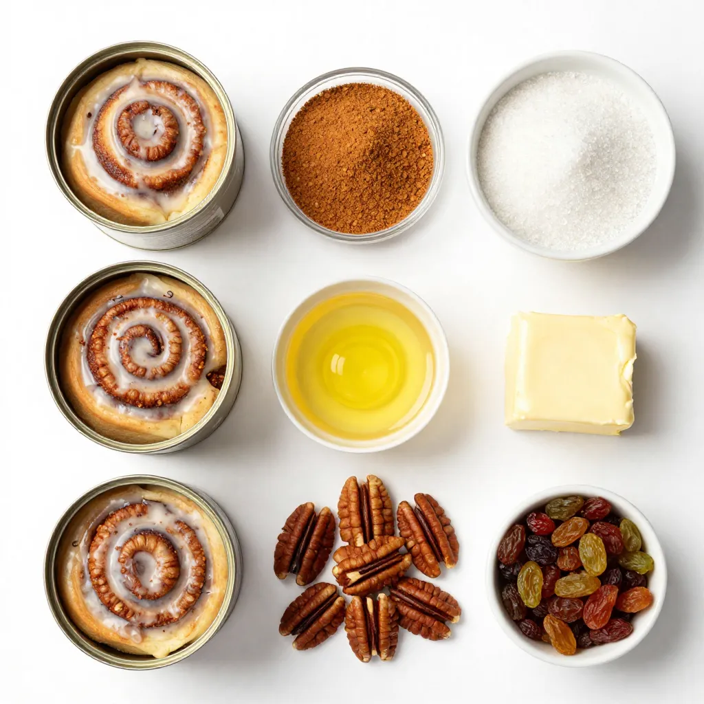 First, gather all the ingredients. You need two cans of refrigerated cinnamon rolls. Each can should be 12 ounces. Also, have a cup of granulated sugar and three tablespoons of ground cinnamon ready. Melt half a cup of unsalted butter in a bowl. If you like, chop half a cup of pecans and set aside a quarter cup of raisins. Preheat your oven to 350°F (175°C). Grease a bundt pan or a deep dish with non-stick spray. This step helps the bread come out easily.