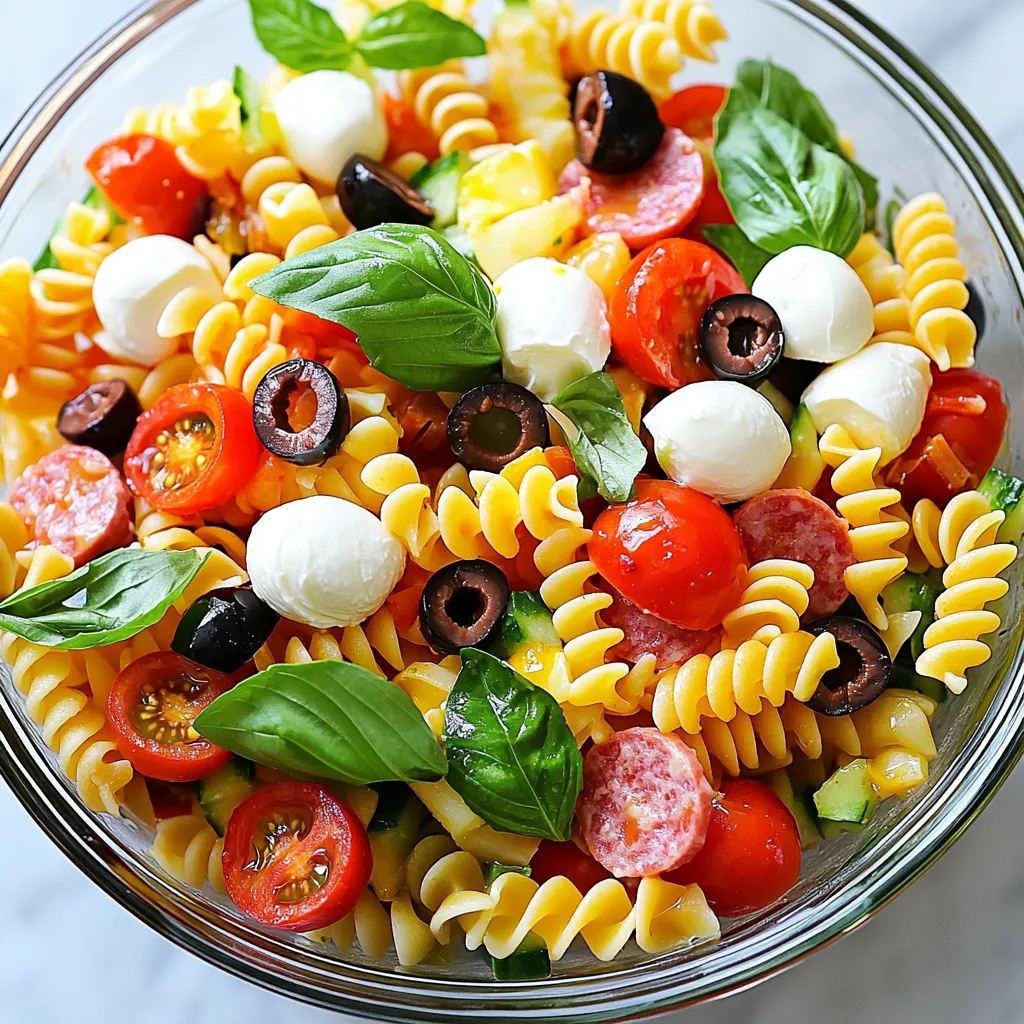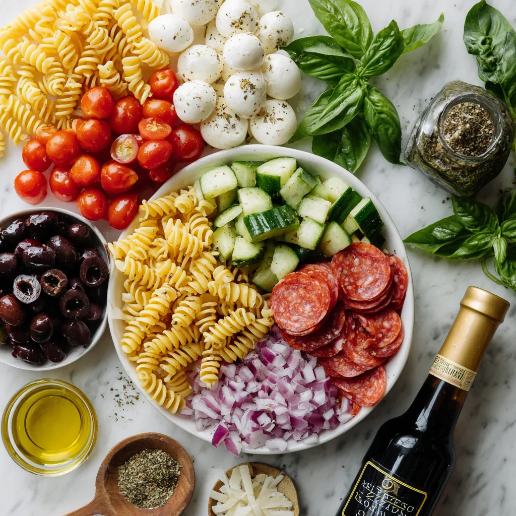 - In a large mixing bowl, combine the cooked pasta, halved cherry tomatoes, diced cucumber, sliced black olives, pepperoni, mozzarella balls, diced red onion, and chopped basil.