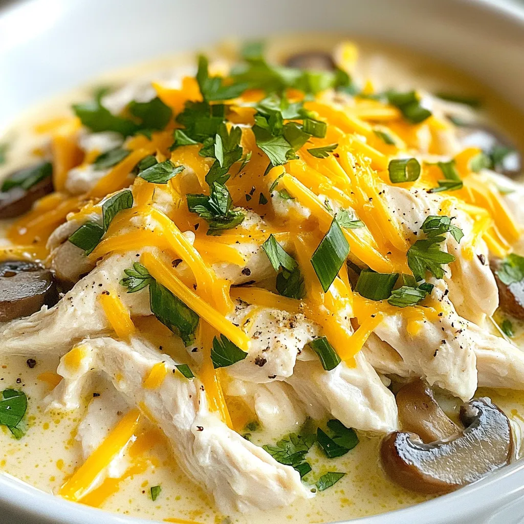 - 4 boneless, skinless chicken breasts - 1 cup cream cheese, softened - 1 packet ranch dressing mix - 1 cup chicken broth - 1 cup shredded cheddar cheese These main ingredients form the base of your dish. The chicken breasts act as the protein source, while cream cheese adds a rich, creamy texture. The ranch dressing mix gives it a distinct flavor, and the chicken broth keeps everything moist. Finally, the cheddar cheese melts beautifully, enhancing the creaminess. - 1 cup sliced mushrooms - 1/2 cup finely chopped green onions - 1 teaspoon garlic powder - Salt and pepper to taste You can add sliced mushrooms for an earthy flavor or green onions for a fresh crunch. Garlic powder boosts the taste without much effort. Adjust salt and pepper to your preference for an extra kick. Pair your Creamy Crockpot Ranch Chicken with side dishes like rice, pasta, or roasted vegetables. These sides complement the creamy sauce well. For a beautiful presentation, garnish your dish with the remaining green onions and fresh parsley. This adds color and freshness, making your meal look as good as it tastes. {{ingredient_image_1}} Seasoning chicken breasts is easy. Start by placing them in the crockpot. Sprinkle salt, pepper, and garlic powder on top. Use your hands to rub the seasonings into the meat. This helps the chicken soak up the flavors. For optimal layering in the crockpot, make sure the chicken breasts are in a single layer. This ensures even cooking. If you have more chicken, stack it carefully. Just be sure to spread the sauce evenly later. To prepare the cream cheese mixture, take a bowl and add the softened cream cheese, ranch dressing mix, and chicken broth. Use a whisk or a fork to blend them together until smooth. This step is vital. A good blend gives your dish a nice, creamy texture. The importance of blending for consistency cannot be overstated. If you see lumps, it can affect the sauce. A smooth sauce will coat the chicken better and make for a great meal. Now, set the crockpot to either low or high. I recommend low for 6-7 hours. This makes the chicken tender and juicy. If you’re short on time, you can set it to high for 3-4 hours. Timing is key for perfect tenderness. If you cook it too long, the chicken might dry out. About 30 minutes before serving, add the shredded cheddar cheese. Let it melt into the creamy mixture for an extra rich flavor. To boost the flavor of your Creamy Crockpot Ranch Chicken, consider adding herbs and spices. Fresh or dried herbs like thyme, oregano, or dill can bring a new taste dimension. You can also add a pinch of paprika or cayenne for some heat. Customizing the ranch profile is another way to make this dish your own. You can use a homemade ranch mix or try different store-bought ranch options. Experiment with flavors to find your favorite blend! Achieving the perfect texture is key to a great creamy sauce. Make sure your cream cheese is softened before mixing. This helps it blend smoothly with the ranch dressing mix and chicken broth. To avoid separation in creamy sauces, stir the mixture well before pouring it over the chicken. Adding the shredded cheese toward the end of cooking helps maintain its creamy texture. For the best techniques for shredding, use two forks. Simply pull the chicken apart in the crockpot. This way, it stays warm and mixes well with the sauce. Mixing tips for an even distribution of sauce are simple. After shredding, stir the chicken in the sauce until it's well coated. This ensures every bite is packed with flavor! Pro Tips Use Thicker Chicken Breasts: Opt for thicker chicken breasts to ensure they stay juicy and tender during the longer cooking time. Customize Your Mushrooms: Feel free to experiment with different types of mushrooms such as cremini or shiitake for added flavor depth. Make It Spicy: Add some crushed red pepper flakes or diced jalapeΓ±os to the mix if you prefer a little heat in your dish. Pairing Suggestions: Serve this creamy chicken over rice, pasta, or mashed potatoes to soak up the delicious sauce. {{image_2}} You can make this dish lighter with a few swaps. Use low-fat cream cheese instead of regular. This keeps the creamy texture while cutting fat. You can also use low-sodium chicken broth to reduce salt. Adding more vegetables boosts nutrition. Try including spinach or bell peppers. They add color and flavor to the dish. To spice things up, consider a spicy ranch version. You can mix in some cayenne pepper or hot sauce. This adds a nice kick. For cheese, try using mozzarella or pepper jack instead of cheddar. Each cheese brings a unique taste. Experimenting with flavors can make your meal even more exciting. You can switch up your chicken choice too. Chicken thighs work well if you prefer dark meat. Rotisserie chicken is another great option. It's cooked and adds more flavor. For sauces, you can use other dressings like blue cheese or Caesar. These swaps keep your meal fresh and interesting. To store leftovers, let the dish cool first. Place it in an airtight container. It will stay fresh for up to three days in the fridge. When reheating, use the microwave or stovetop. Heat it until it is warm throughout. Stir it well to keep it creamy. To freeze the creamy chicken, wait until it cools completely. Then, transfer it to a freezer-safe container. Leave some room at the top, as the sauce may expand. It can stay in the freezer for up to three months. When ready to eat, move it to the fridge to defrost overnight. For reheating, use a slow cooker or stovetop. Heat it gently to avoid separation. To maintain quality and safety, always store the chicken properly. Check for signs of spoilage. If it smells off or has a strange color, throw it away. Fresh leftovers should smell good and look appealing. If you're unsure, it is better to be safe. Cook the chicken on low for 6 to 7 hours. If you choose high, cook for 3 to 4 hours. The chicken will be tender and fully cooked when done. Cooking on low gives better fl
