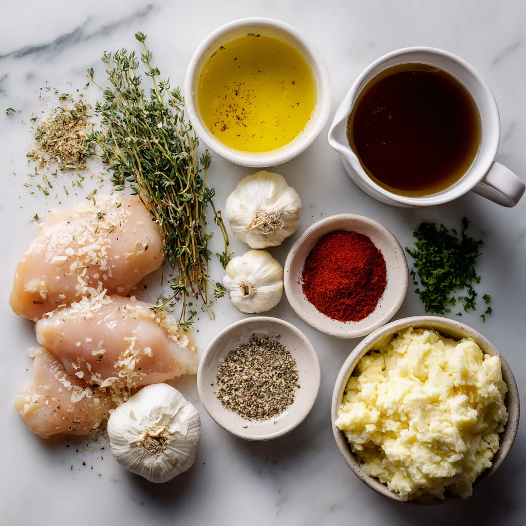 You will also need olive oil for cooking the chicken. Seasonings like thyme, smoked paprika, onion powder, salt, and pepper enhance the taste. You can use mashed potatoes as a side that pairs perfectly with the creamy chicken.