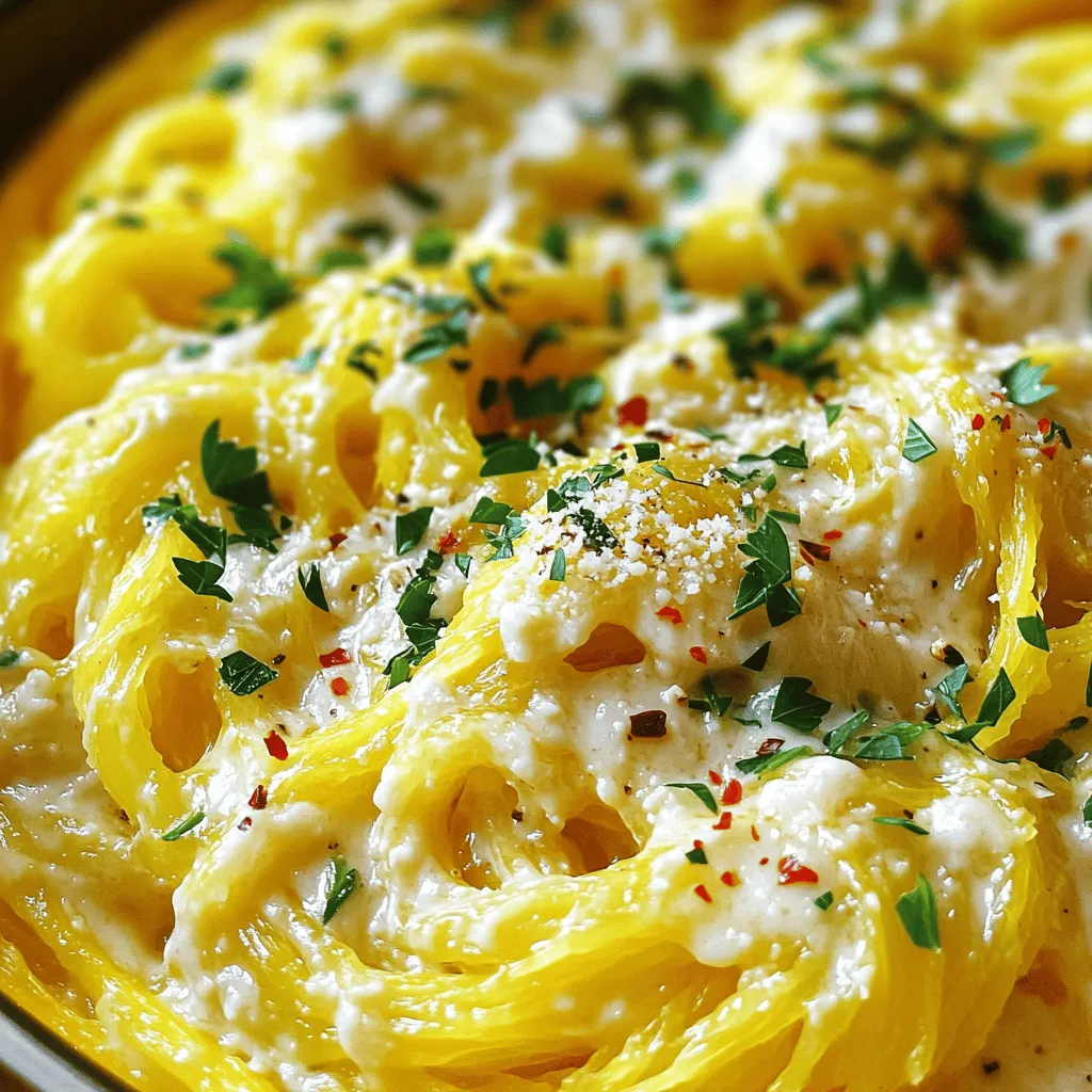 The star of this dish is the spaghetti squash. It is a great low-carb option that mimics pasta. Olive oil adds a rich flavor and helps with cooking. Garlic gives the dish its aromatic touch. Heavy cream makes the sauce creamy and rich. Parmesan cheese adds a salty, nutty taste.