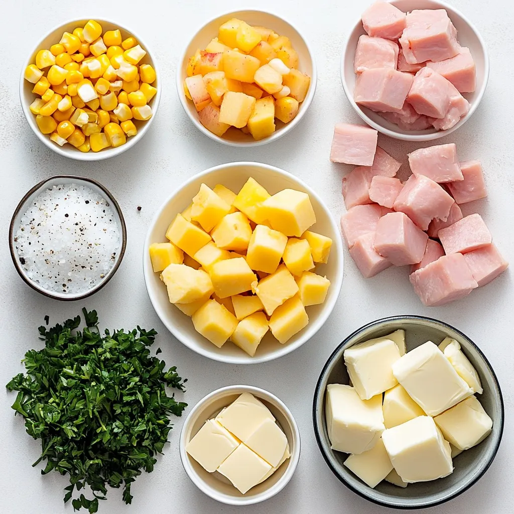 To make a tasty creamy ham and corn chowder, these ingredients are key. The diced ham gives it a nice, savory depth. I love using fresh onion and garlic for flavor. Potatoes add a hearty touch, making the soup feel filling. Sweet corn brings a natural sweetness that balances the dish. Chicken broth helps tie everything together, creating a warm base. Heavy cream is essential for that rich, creamy texture. Don’t forget the thyme, salt, and pepper to enhance the flavors.