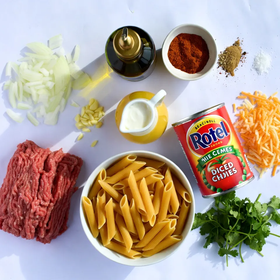 Gather these simple ingredients for a tasty Creamy Rotel Beef Pasta:
