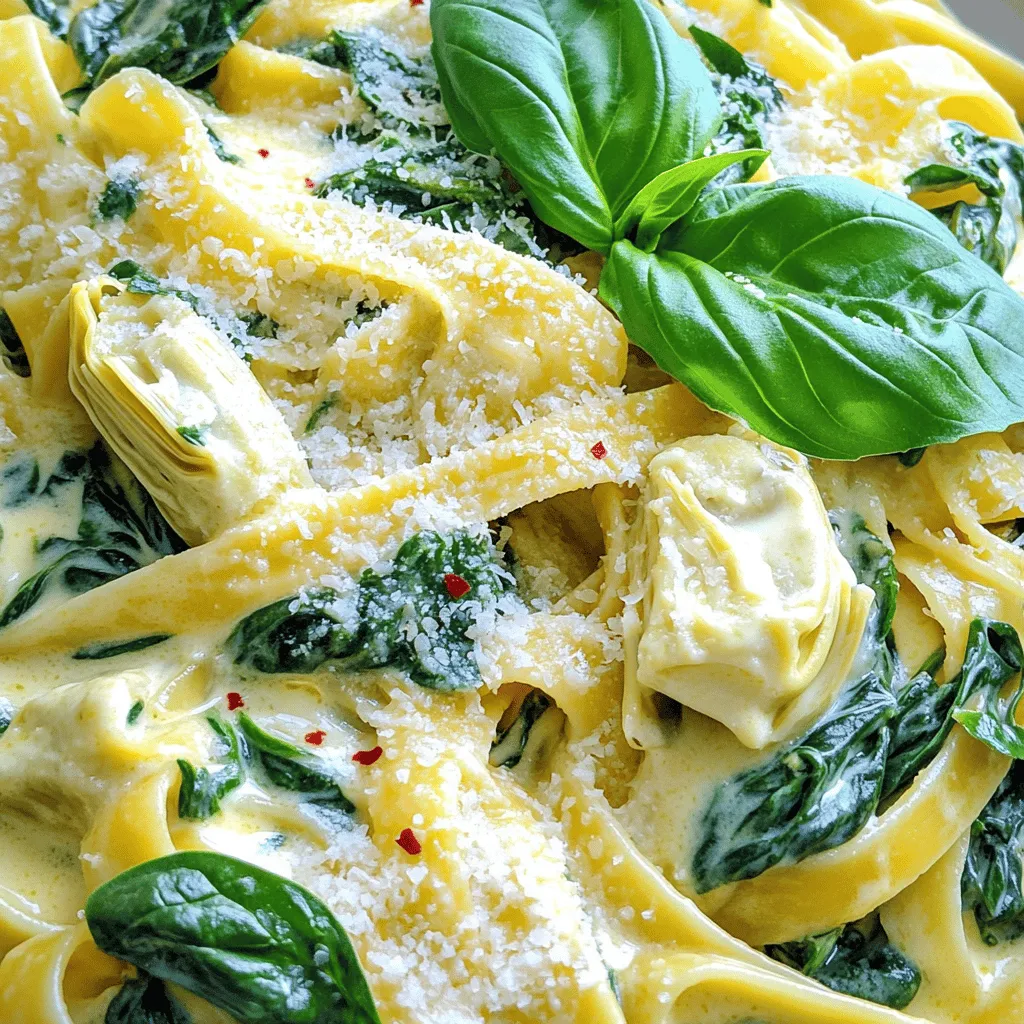 These ingredients come together to create a rich and tasty dish. The fettuccine acts as a perfect base. The fresh spinach adds color and nutrition. Artichoke hearts bring a unique flavor that complements the creaminess. Heavy cream and cream cheese create the sauce’s rich texture. Parmesan adds a savory touch to every bite. Garlic gives the dish a warm aroma and delicious taste. Olive oil helps sauté the garlic and adds a bit of richness.