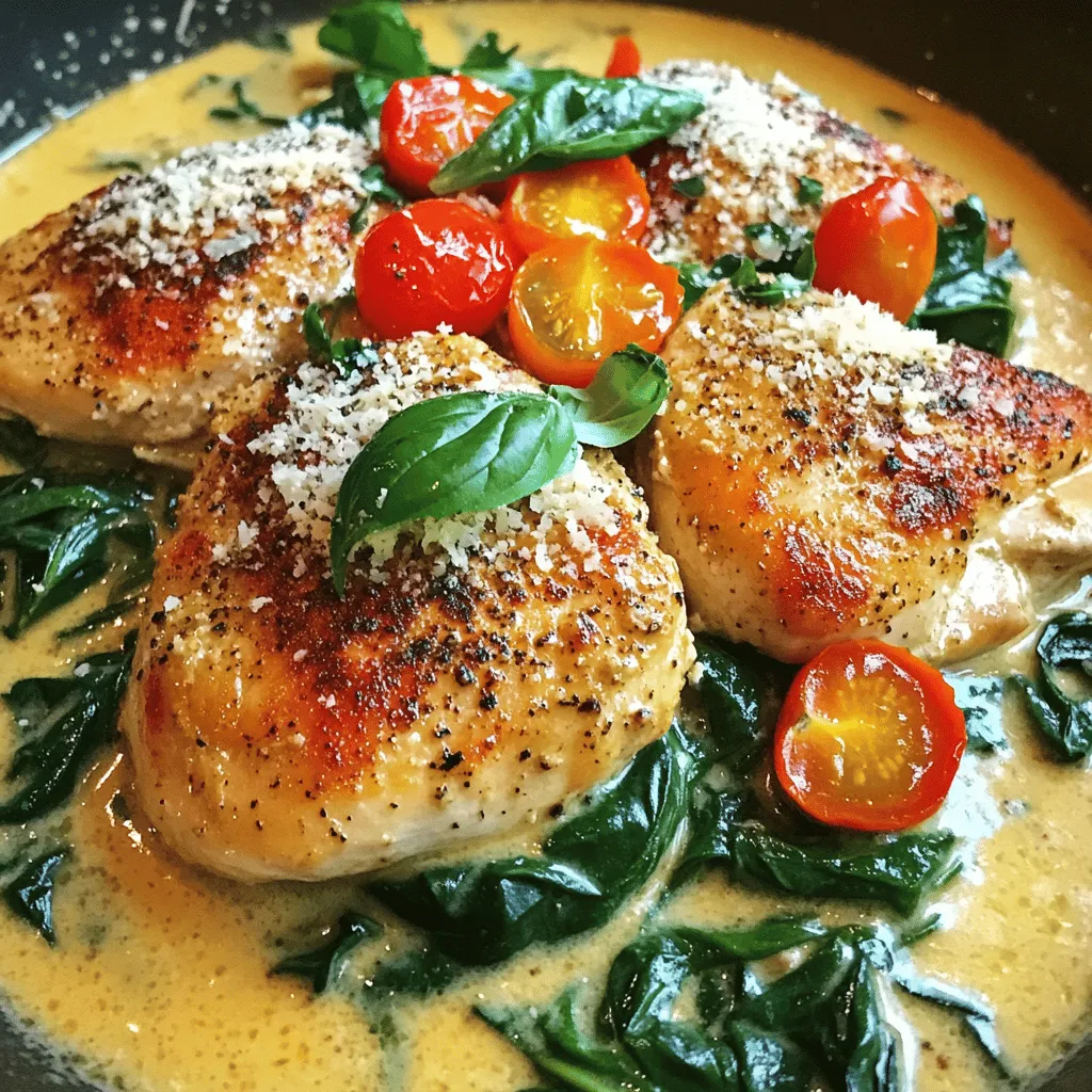 - 4 boneless, skinless chicken breasts - 2 tablespoons olive oil - Salt and pepper, to taste - 3 cloves garlic, minced - 1 cup cherry tomatoes, halved - 2 cups fresh spinach - 1 cup heavy cream - ½ cup grated Parmesan cheese - 1 teaspoon Italian seasoning - Fresh basil for garnish To make Creamy Tuscan Chicken, you need fresh and simple ingredients. The chicken breasts are the star of this dish. They soak up all the flavors from the sauce. I recommend using boneless and skinless chicken for ease. Next, olive oil adds a nice richness. You will use it to sear the chicken. Salt and pepper are your basic seasonings. They enhance the chicken’s taste. Garlic gives a wonderful aroma and flavor. Fresh garlic is best for this recipe. Cherry tomatoes add sweetness and color. Halving them helps them cook quickly. Spinach brings a fresh touch and bright green color. It wilts perfectly in the sauce. Heavy cream creates that luxurious, creamy texture. It makes the dish feel indulgent. Parmesan cheese adds a salty, nutty taste. It melts beautifully into the sauce. Italian seasoning brings all the herbs together. It gives that classic Tuscan flavor. Lastly, fresh basil is perfect for garnish. It adds a pop of color and freshness. These ingredients come together for a delightful and easy dinner. - Patting Dry and Seasoning Chicken: Start by patting the chicken breasts dry with paper towels. This helps get a nice sear. Next, season both sides with salt and pepper. This adds flavor and brings out the chicken's taste. - Heating Olive Oil for Searing: In a large skillet, heat 2 tablespoons of olive oil over medium-high heat. You want the oil hot but not smoking. This will help you get a golden crust on the chicken. - Searing Chicken Breasts: Once the oil is hot, add the chicken breasts. Sear them for about 5 to 6 minutes on each side. You want them golden brown and fully cooked. After that, remove the chicken from the skillet and set it aside. - Sautéing Garlic and Tomatoes: In the same skillet, lower the heat to medium. Add 3 cloves of minced garlic and sauté for 1 minute until fragrant. Then, toss in 1 cup of halved cherry tomatoes. Cook them for 2 to 3 minutes until they soften up a bit. - Adding Spinach and Cream Sauce: Now, stir in 2 cups of fresh spinach. Cook until the spinach wilts, which takes about 1 to 2 minutes. Next, pour in 1 cup of heavy cream. Add ½ cup of grated Parmesan cheese and 1 teaspoon of Italian seasoning. Mix well and let the sauce simmer for about 3 to 4 minutes until it thickens slightly. - Combining Chicken with Sauce: Finally, add the seared chicken back into the skillet. Spoon the creamy sauce over the chicken. Let it simmer together for an additional 2 to 3 minutes. This helps all the flavors mix well. - Plating the Dish: When ready to serve, place the chicken on a plate. Make sure to drizzle some of the creamy sauce over the top. - Garnishing with Basil: Finish your dish by garnishing it with fresh basil. This adds a pop of color and flavor to your creamy Tuscan chicken. Enjoy your meal! Perfectly Searing Chicken To get a nice sear on your chicken, start with a dry surface. Pat the chicken breasts with paper towels. This helps the oil stick better. Heat your skillet over medium-high heat and add olive oil. Place the chicken in the hot skillet. Don't move it for 5-6 minutes. This helps develop a golden crust. Flip the chicken and repeat on the other side. It should be cooked through and browned perfectly. Thicken Cream Sauce Without Curds To avoid curds in your cream sauce, keep the heat at medium. Stir the cream gently into the skillet. Add the Parmesan cheese slowly while stirring. This helps it melt without clumping. Let the sauce simmer for 3-4 minutes. It will thicken nicely while staying smooth. Adding More Vegetables You can boost nutrition and flavor by adding more veggies. Consider bell peppers or zucchini for a sweet crunch. Mushrooms add a rich, earthy flavor. Just sauté them with the garlic and tomatoes. This adds color and makes the dish more filling. Alternative Seasonings Feel free to get creative with your seasonings. Instead of Italian seasoning, try fresh herbs like thyme or rosemary. A pinch of red pepper flakes can add heat. Lemon zest can brighten the dish and add freshness. Play around to find your favorite flavor profile. Best Skillet for Cooking A large, heavy skillet is best for this dish. Cast iron or stainless steel skillets heat evenly. They can handle high heat without warping. Non-stick pans work too, but you may not get as nice a sear. Choose one that feels good in your hand. Tools for Easy Cleanup To make cleanup easier, use a spatula made of silicone or wood. These won’t scratch your skillet. Have a good set of measuring cups and spoons. A whisk helps mix the sauce well. Lastly, keep some kitchen towels handy for quick wipes. {{image_2}} You can easily change the protein in this dish. If you want a seafood option, use shrimp instead of chicken. Just sauté the shrimp until they turn pink. For a plant-based meal, tofu works well. Use firm tofu and cook it until golden brown. You can also swap the heavy cream for a lighter option. Try using half-and-half or coconut cream. Both will give you a nice creamy texture while saving some calories. Herbs play a big role in flavor. You can add herbs like thyme or oregano for a new taste. Fresh parsley also brightens the dish. Just sprinkle some on top before serving. If you love cheese, you can switch it up too. Try using feta or goat cheese instead of Parmesan. These cheeses will give a unique flavor twist to your creamy sauce. For those who need gluten-free options, this recipe is already safe. Just make sure your chicken broth and any seasoning blends are gluten-free. If you're watching your carbs, you can serve this dish with zucchini noodles or cauliflower rice. Both options are low in carbs but still filling. They soak up the creamy sauce well, making each bite a delight. To keep your Creamy