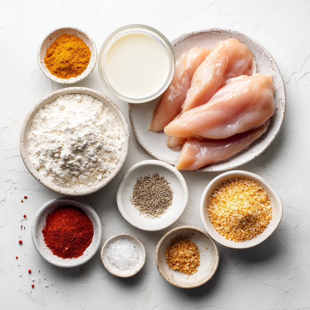 - 1 pound boneless, skinless chicken breasts - 1 cup buttermilk - 1 cup all-purpose flour - 1 teaspoon garlic powder - 1 teaspoon onion powder - 1 teaspoon smoked paprika - 1 teaspoon salt - ½ teaspoon black pepper - ½ teaspoon cayenne pepper (optional for heat) - 1 cup breadcrumbs (panko preferred for extra crunch) - Cooking spray or olive oil spray For this recipe, I focus on simple, quality ingredients. The chicken breasts are the star, providing a tender bite. Buttermilk does wonders, keeping the chicken juicy. Flour helps create a nice crust. The seasonings boost flavor. Garlic and onion powder add depth. Smoked paprika gives a warm touch. Salt and pepper bring balance. Cayenne adds a hint of heat, but feel free to skip it if you prefer mild. Panko breadcrumbs are my go-to for crunch. They create a crispy outer layer that makes each bite delightful. A light spray of oil ensures an even golden finish. Gather these ingredients, and you will be on your way to making delicious crispy air fryer chicken tenders. {{ingredient_image_1}} Start by soaking your chicken strips in buttermilk. This step is key. The buttermilk helps tenderize the meat and adds flavor. I recommend marinating for at least 30 minutes. This gives the chicken time to soak up all that goodness. Next, mix the dry ingredients for the coating. In a shallow dish, combine 1 cup of all-purpose flour, 1 teaspoon each of garlic powder, onion powder, smoked paprika, salt, and black pepper. If you like some heat, add ½ teaspoon of cayenne pepper. In another dish, place 1 cup of breadcrumbs. Panko works best for extra crunch. Once the chicken has marinated, take it out and shake off any excess buttermilk. Dip each strip into the flour mixture first. Then, shake off the excess flour. Next, dip the strip into the breadcrumbs. Press down gently. This helps the breadcrumbs stick well. Before you cook, preheat your air fryer to 400°F (200°C) for about 5 minutes. While it heats, spray the air fryer basket with cooking spray. This will help the chicken not to stick. Now it’s time to cook! Place the coated chicken strips in a single layer in the basket. Spray the tops lightly with olive oil spray. Cook for 8-10 minutes. Flip the chicken halfway through for even cooking. Check for doneness. The internal temperature should reach 165°F (75°C). Once cooked, carefully remove the chicken tenders. Let them rest for a couple of minutes before serving. This helps keep them juicy. Serve warm with your favorite dipping sauces. Honey mustard or barbecue sauce is a great choice! To get that perfect crunch, use panko breadcrumbs. They create a light and crispy coating. Regular breadcrumbs can work, but panko gives a better texture. For even coating, shake off excess flour and breadcrumbs. This helps the coating stick. Make sure each piece is well-coated for the best crunch. You can boost flavor by adding herbs and spices to the coating mix. Try adding dried oregano or thyme for a fresh taste. For a kick, increase the cayenne pepper. Marinating is also key. Soaking chicken in buttermilk adds flavor and keeps it juicy. Let it marinate for at least 30 minutes to really absorb those flavors. For the best look, arrange the chicken tenders on a nice platter. You can garnish with fresh parsley or basil for color. Pair with dipping sauces like honey mustard or barbecue for added flavor. Serve with crunchy veggies or fries on the side for a fun meal. Pro Tips Marination Magic: Allow the chicken to marinate in buttermilk for at least 1 hour, or up to overnight, for maximum tenderness and flavor. Crunchy Coating: Use panko breadcrumbs for an extra crispy texture that elevates your chicken tenders. Even Cooking: Ensure the chicken strips are of uniform size for even cooking and browning in the air fryer. Resting Time: Let the chicken tenders rest for a few minutes after cooking to maintain juiciness before serving. {{image_2}} You can change up the flavors of your chicken tenders easily. Here are two tasty ideas: - BBQ chicken tenders: After coating your chicken, brush on your favorite BBQ sauce before air frying. This adds a sweet and smoky flavor that is hard to resist. - Spicy buffalo chicken tenders: Mix hot sauce into your buttermilk for a spicy kick. You can also toss the cooked tenders in buffalo sauce for extra heat. If you want a gluten-free meal, it's easy to swap out some ingredients. Use gluten-free flour instead of all-purpose flour. For the breading, choose gluten-free breadcrumbs. This way, you can enjoy crispy chicken without the gluten. Not everyone has an air fryer, and that's okay! You can bake the chicken tenders in the oven. Here’s how: - Preheat your oven to 400°F (200°C). - Place the coated chicken strips on a baking sheet lined with parchment paper. - Spray them lightly with cooking spray for a crispy finish. - Bake for 15-20 minutes, flipping halfway. Check that the chicken reaches 165°F (75°C) for safety. These variations let you enjoy chicken tenders your way! To store leftovers, let the chicken tenders cool first. Place them in an airtight container. This helps keep them fresh. I recommend using glass containers. They hold heat well and do not stain. Store the chicken tenders in the fridge for up to three days. To freeze chicken tenders, let them cool completely. Then, place them on a baking sheet in a single layer. Freeze until solid, about 1-2 hours. After that, transfer them to a freezer-safe bag. Remove as much air as possible. Chicken tenders can last up to three months in the freezer. For reheating, use the air fryer if you want to keep them crispy. Preheat the air fryer to 350°F (175°C). Place the chicken tenders in the basket. Heat for about 5-7 minutes. You can also use the oven. Set it to 375°F (190°C) and bake for 10-15 minutes. This keeps them warm and crispy. Yes, you can use frozen chicken strips! Here are tips for using them: - Thaw first: Let the chicken strips thaw in the fridge overnight. - Marinate: