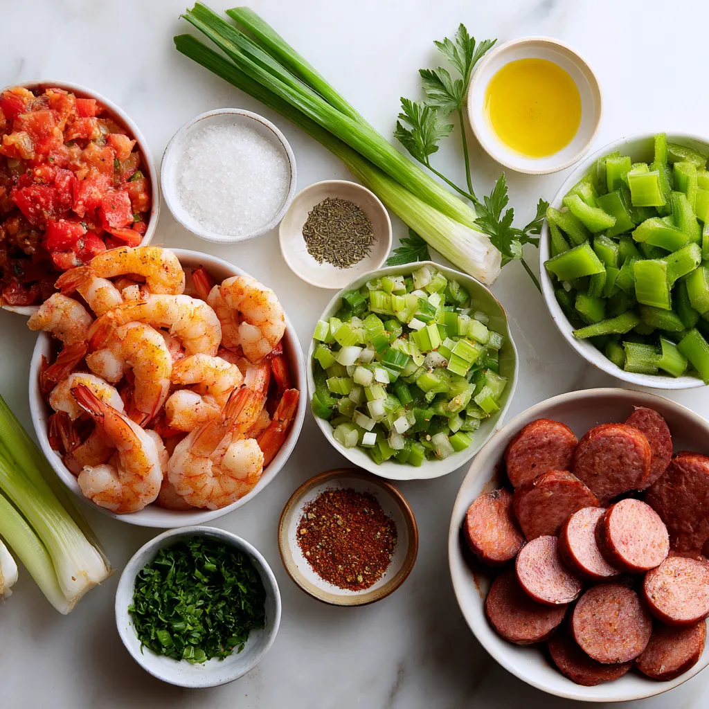 To make a tasty shrimp and sausage gumbo, gather these must-have items: