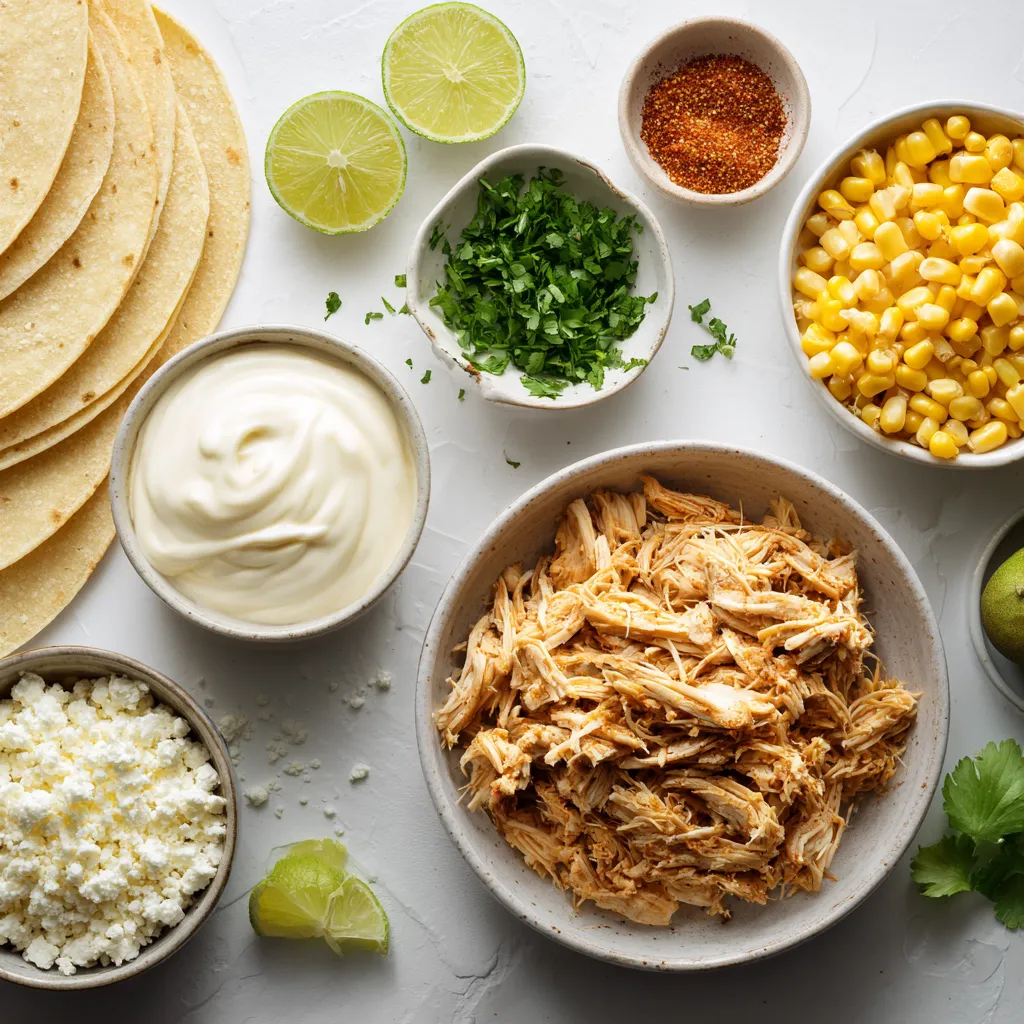 - Assemble the Tacos: Start with one tortilla, layer a generous amount of shredded fried chicken, followed by a few spoonfuls of the sautéed corn, and then drizzle over the street corn sauce you prepared earlier.