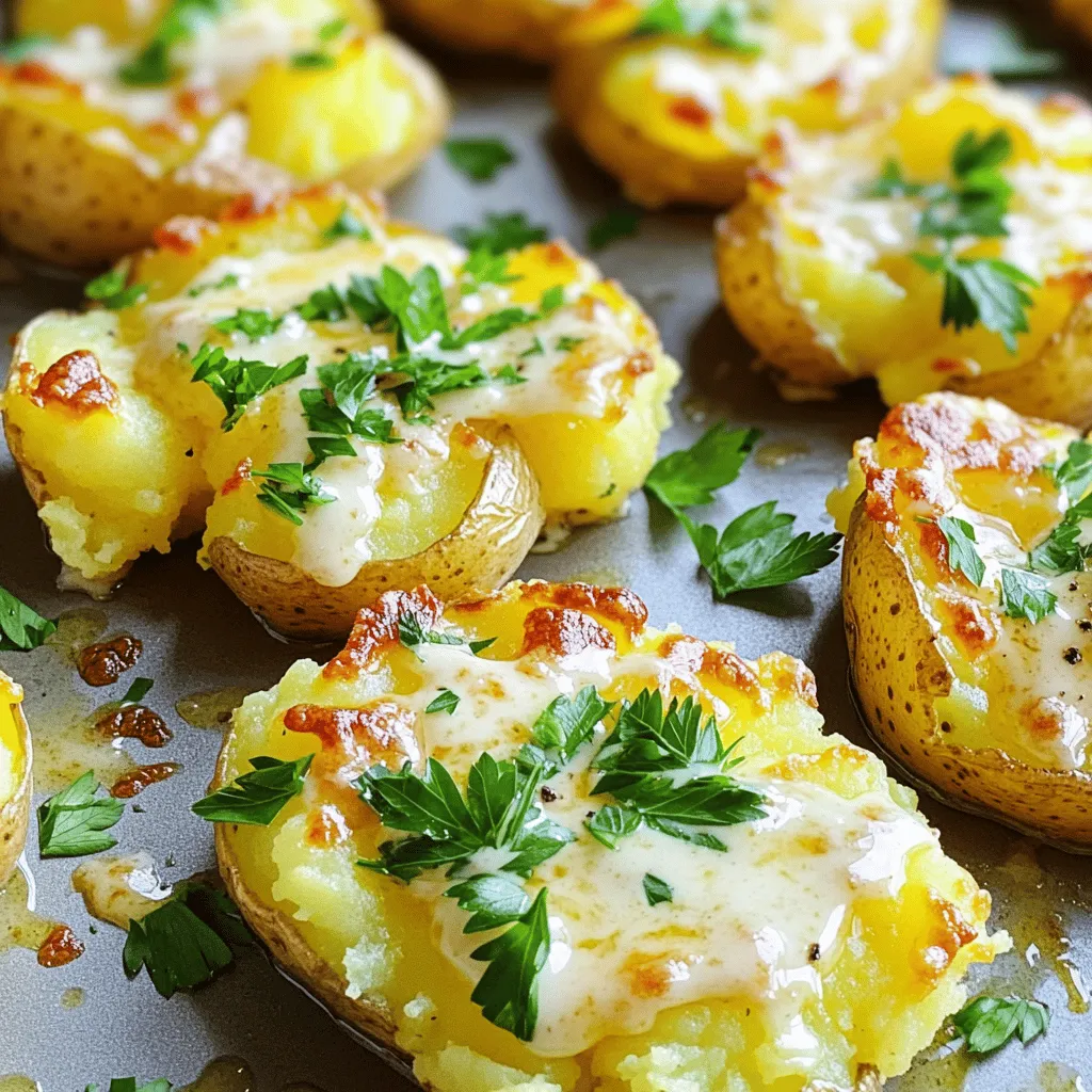 Preheat your oven to 425°F (220°C). Take a lined baking sheet and place the cooled potatoes on it. Use the bottom of a glass or a potato masher to gently smash each potato. You want them to stay mostly intact but flattened a bit. Next, drizzle your garlic mixture over the smashed potatoes. Make sure each potato is well coated. Finally, bake in the preheated oven for about 20 to 25 minutes. The edges should become crispy and golden brown. After baking, sprinkle the remaining Parmesan cheese on top. Return the baking sheet to the oven for five more minutes. This step melts the cheese and makes it bubbly. When done, remove from the oven and add chopped parsley for a fresh touch.