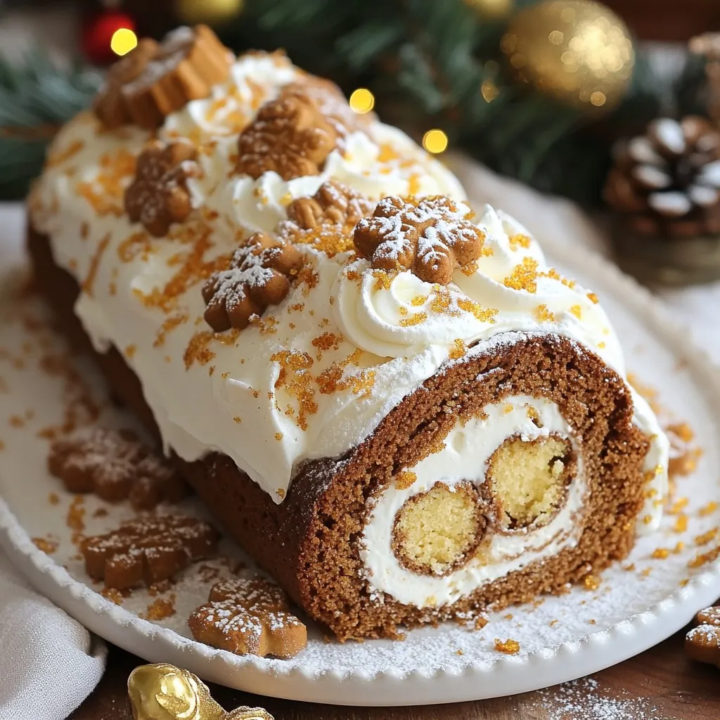 - Chill and serve: Refrigerate the cake roll for at least 1 hour to set (it can be made a day ahead). Before serving, dust the top with additional powdered sugar and garnish with crushed gingerbread cookies or festive sprinkles if desired.