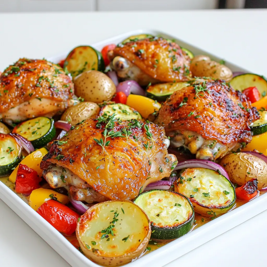 In a large bowl, mix the chicken thighs with baby potatoes, red bell pepper, yellow bell pepper, zucchini, and red onion. This blend gives great color and flavor. In a separate small bowl, whisk olive oil, minced garlic, chopped rosemary, chopped thyme, paprika, salt, and pepper. This herb mix adds a lovely taste. Pour it over the chicken and veggies. Toss everything together until well coated.