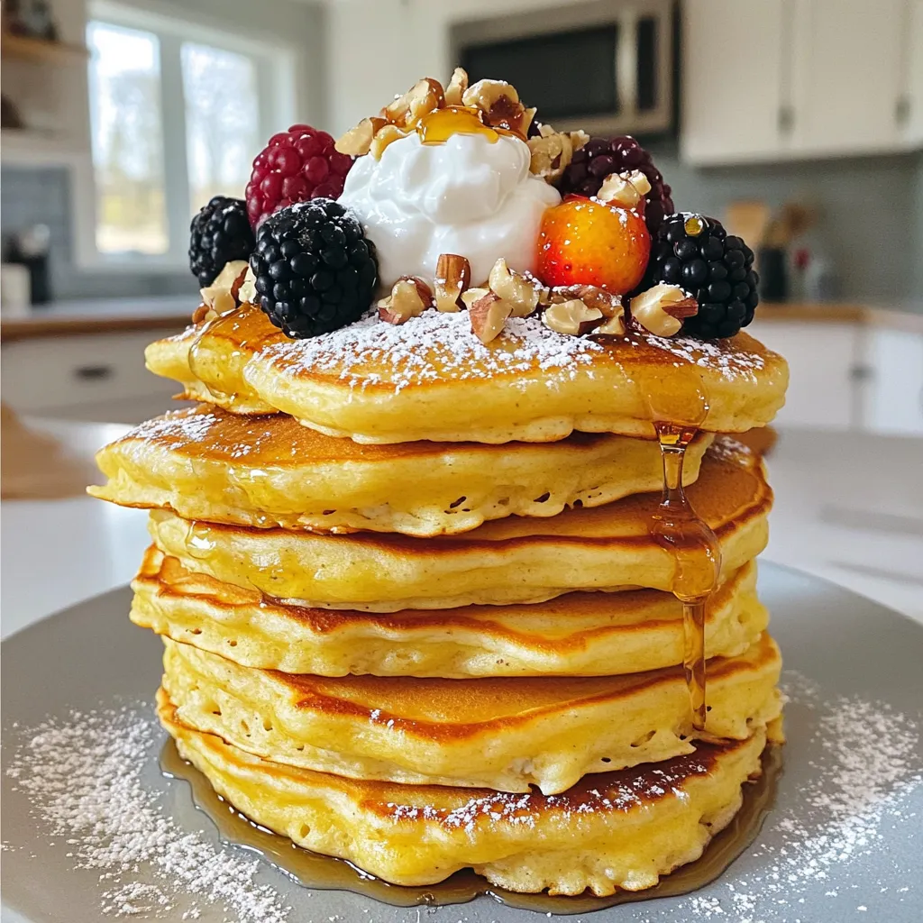 Stack the pancakes high for a nice look. Garnish with fresh berries or a sprinkle of nuts. This adds color and texture. Serve with a side of Greek yogurt for more protein.