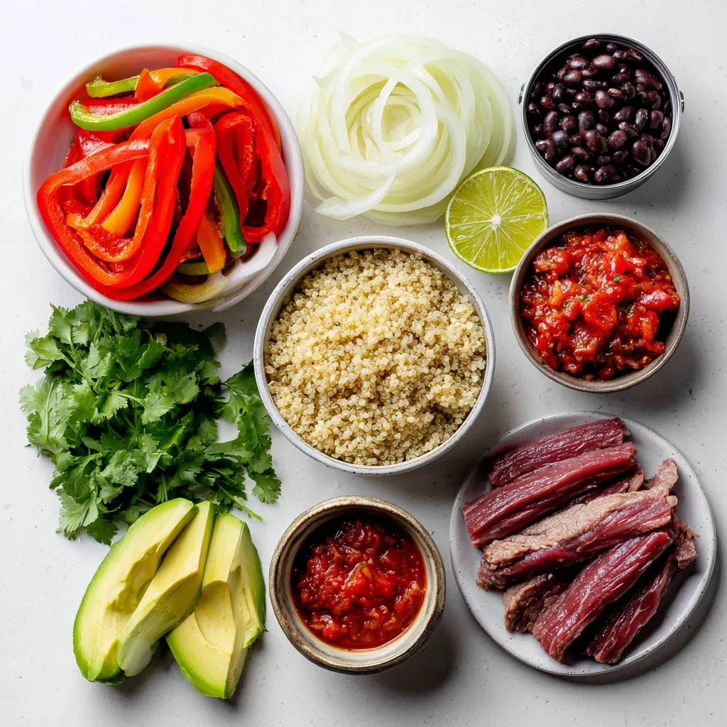 You can swap flank steak for chicken or shrimp. Both options work well. For a plant-based meal, try tofu or tempeh. Instead of quinoa or brown rice, use cauliflower rice for a low-carb dish. You can also use lentils for more protein. If you can’t find bell peppers, zucchini slices are a great choice. Feel free to switch toppings, too! Try Greek yogurt instead of sour cream or add corn for sweet crunch.