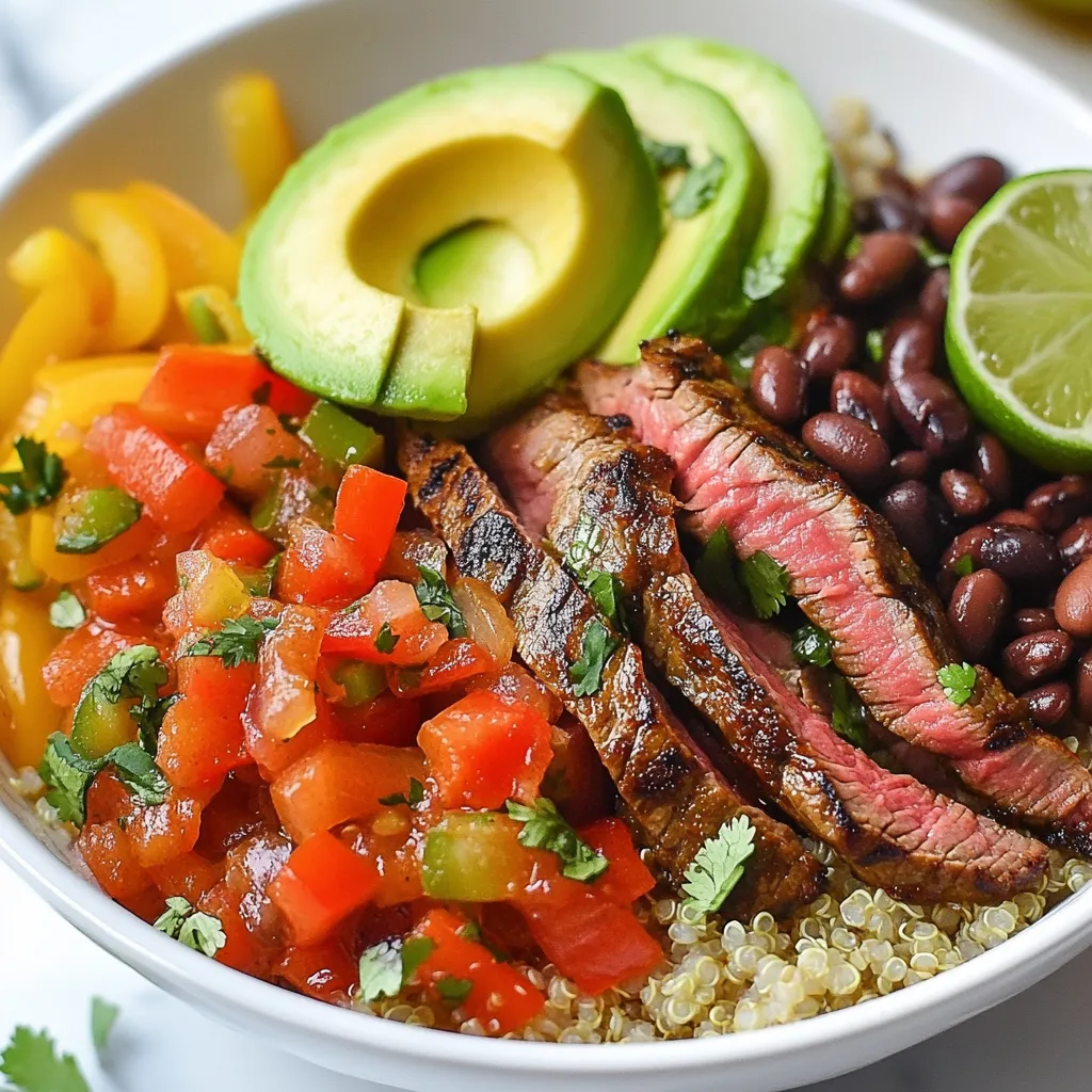 Now it’s time to build your bowls! Start with a scoop of cooked quinoa or brown rice at the bottom. Layer the sautéed vegetables next, followed by the cooked steak. Add a portion of black beans on top. Then, place sliced avocado and a generous spoonful of salsa. For the finishing touch, sprinkle with freshly chopped cilantro. Serve with lime wedges for an extra zing. This makes not just a tasty meal, but a beautiful one too.