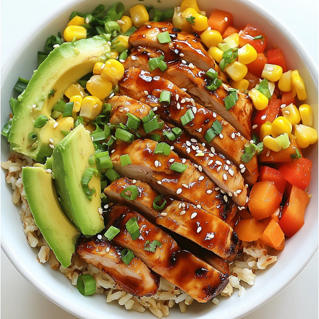 To assemble your Honey BBQ Chicken Rice Bowl, start by layering the cooked brown rice at the bottom of each serving bowl. Then, add the sautéed vegetables on top. Next, place the sliced BBQ chicken over the veggies. Don’t forget to add sliced avocado for creaminess. Finally, sprinkle chopped green onions and sesame seeds for an extra touch. If you like, drizzle a little extra BBQ sauce over the top before serving. Enjoy your delicious creation!