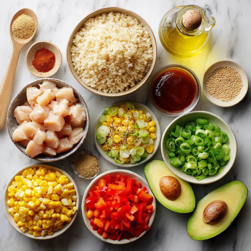 The main ingredients create a tasty base for your Honey BBQ Chicken Rice Bowl. The chicken provides protein and flavor. The brown rice gives you a hearty base. The honey-infused BBQ sauce ties it all together with sweet and smoky goodness. Seasonings like smoked paprika and garlic powder add depth.
