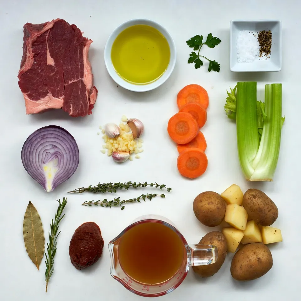 Next, gather your vegetables. Onions and garlic add a strong base flavor. Carrots, celery, and potatoes provide sweetness and texture. I love using fresh potatoes for their creaminess in the stew.