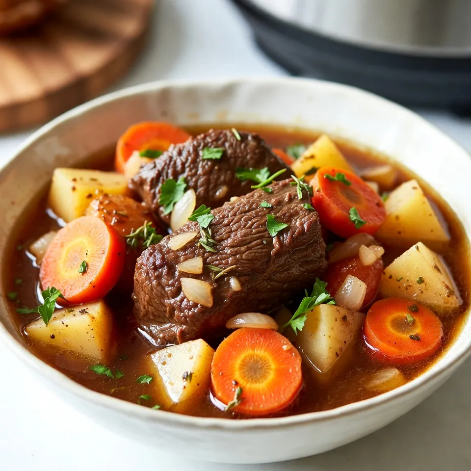 - 2 pounds beef chuck, cut into 1-inch cubes - 4 medium carrots, sliced - 3 large potatoes, diced - 1 yellow onion, chopped - 3 cloves garlic, minced - 4 cups beef broth - 2 tablespoons tomato paste - 1 tablespoon Worcestershire sauce - 1 teaspoon dried thyme - 1 teaspoon dried rosemary - Salt and pepper to taste - 2 tablespoons olive oil To make a great beef stew, start with quality beef chuck. It has enough fat to keep the stew rich and tasty. Pick firm, fresh carrots and potatoes. They add sweetness and texture. Onions and garlic bring depth to the dish. They create a wonderful base. Beef broth is key for flavor. Use homemade broth if you can. It enhances the stew's taste. Tomato paste adds richness, while Worcestershire sauce gives a savory kick. Fresh herbs like thyme and rosemary will make your stew shine. - 2 tablespoons cornstarch (for thickening) - Fresh parsley, chopped (for garnish) If you want a thicker stew, cornstarch helps. It creates a perfect texture. Fresh parsley is lovely on top. It adds color and a fresh taste. - Instant Pot - Cutting board and knife - Measuring spoons and cups Using an Instant Pot makes cooking quick and easy. A good cutting board and knife help you prep the veggies. Measuring spoons and cups ensure you get the right amounts of each ingredient. {{ingredient_image_1}} - Searing the beef cubes First, set your Instant Pot to 'Sauté' mode. Add the olive oil and let it heat. While it heats, season the beef cubes with salt and pepper. Place the beef in the pot in batches. Sear until browned on all sides. Remove the beef and set it aside. - Sautéing onion and garlic In the same pot, add the chopped onion and minced garlic. Cook until they are fragrant and tender. This should take about 3 to 4 minutes. - Adding tomato paste and seasonings Now, stir in the tomato paste, Worcestershire sauce, dried thyme, and rosemary. Cook for one more minute to blend the flavors well. - Adding beef broth and vegetables Return the seared beef to the pot. Add the sliced carrots and diced potatoes. Pour in the beef broth, making sure to scrape up any browned bits from the bottom. This adds great flavor! - Setting the Instant Pot and cooking time Close the lid and set the valve to 'Sealing.' Select 'Pressure Cook' and set the timer for 35 minutes at high pressure. This will cook the beef and vegetables until tender. Using homemade broth adds depth. It brings out the beef's natural taste. Store-bought broth works well too. Choose a low-sodium option to control salt. Taste as you go. Add more herbs or spices if needed. A pinch of sugar can balance acidity. To thicken the stew, mix cornstarch with a bit of broth. Stir this slurry in towards the end. Cook for about five minutes. This helps the stew get nice and thick. Different cuts of beef cook differently. Chuck roast is great for stews. It becomes tender after pressure cooking. Serve the stew hot for the best flavor. Let it cool a bit before serving. Pair it with crusty bread or a fresh salad. Mashed potatoes also complement the dish. Enjoy your hearty stew! Pro Tips Brown the Beef: For a deeper flavor, ensure the beef is well-browned before adding other ingredients. This step enhances the overall taste of the stew. Use Fresh Herbs: If possible, use fresh thyme and rosemary instead of dried for a brighter, more aromatic flavor in your stew. Adjust Consistency: If you prefer a chunkier stew, feel free to reduce the amount of broth or add more vegetables to your liking. Let It Rest: For the best flavor, allow the stew to sit for at least 30 minutes after cooking. This gives the flavors time to meld together. {{image_2}} You can switch beef for other proteins. Chicken works well in this stew. Just cut it into chunks like the beef. Pork also adds a nice flavor. Use pork shoulder for the best results. For a vegetarian option, try hearty mushrooms or lentils. Both give a great texture and flavor. You can even use chickpeas for protein. Want more flavor? Add red wine or a splash of beer. These drinks deepen the taste of the stew. If you want to go bold, try adding more herbs. Fresh thyme or basil can brighten your stew. You can also add a pinch of smoked paprika for a warm kick. Don't shy away from experimenting with spices! Seasonal vegetables can make your stew shine. In winter, use root veggies like parsnips or turnips. In summer, toss in zucchini or bell peppers. Adjust your stew for the weather. A lighter stew is great for warm days. You can even serve it cold as a salad! Just keep the core recipe and modify as you like. To store your beef stew, let it cool first. Place leftovers in airtight containers. Glass or BPA-free plastic containers work well. This keeps the stew fresh and tasty. Make sure to refrigerate it within two hours of cooking. You can freeze beef stew for later use. Allow it to cool completely before freezing. Use freezer-safe containers or bags. Leave some space for expansion. To reheat, thaw it in the fridge overnight. Heat on the stove or in the microwave until hot. Stir well and enjoy! In the fridge, the stew lasts about 3 to 4 days. Look for signs of spoilage. If it smells bad or has mold, it’s time to throw it away. Always trust your senses. Keeping the stew in the right container extends its life. It takes about 35 minutes to cook beef stew in an Instant Pot. You also need to add time for the pot to heat up and for the pressure to release. This means the total time is around one hour. Yes, you can use frozen beef for this stew. Just make sure to add a few extra minutes to the cooking time. It’s best to cut the beef into smaller pieces before freezing. This helps it cook more evenly. If you don’t have beef broth, you can use chicken broth or vegetable broth. You can also make broth by mixing water with soy sauce and spices. This adds flavor and works well in the stew. To thicken your stew without cornstarch, you can mash some of the potatoes in the pot. Another option is to let the stew cook a bit lon