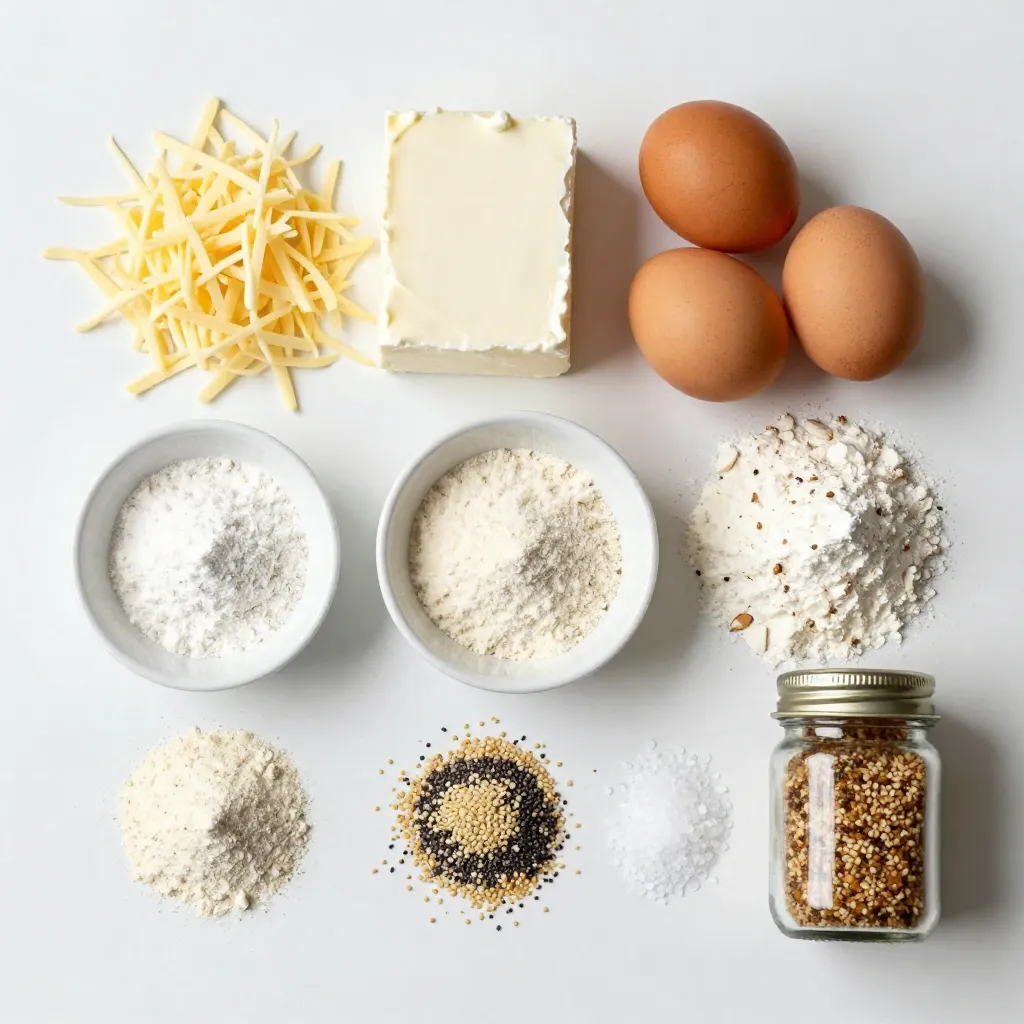 • In another bowl, mix together the almond flour, baking powder, garlic powder, onion powder, sesame seeds, poppy seeds, and sea salt. Gradually add this dry mixture to the cheese and egg mixture, stirring until a soft dough forms.