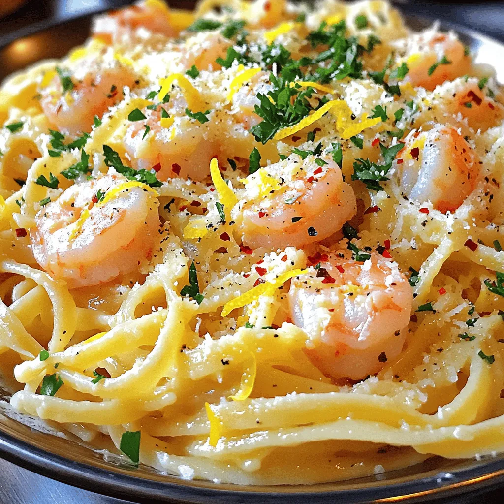 To make Lemon Garlic Shrimp Linguine, you need these key items: - 8 oz linguine pasta - 1 lb large shrimp, peeled and deveined - 4 cloves garlic, minced - 2 tablespoons olive oil - 1 tablespoon butter - Zest and juice of 1 lemon - 1/2 teaspoon red pepper flakes - Salt and pepper to taste - 1/4 cup fresh parsley, chopped - Grated Parmesan cheese for serving These ingredients create a tasty, fresh dish. The shrimp and garlic pair well with zesty lemon. You can add more flavor with these extras: - Cherry tomatoes for sweetness - Spinach for color and nutrition - Capers for a briny touch - A splash of white wine for depth These options let you customize the dish to your taste. You can mix and match to find what you love. If you need alternatives, here are some swaps: - Use spaghetti or fettuccine instead of linguine. - Swap shrimp for scallops or chicken. - Replace fresh parsley with basil or cilantro. - Use lemon juice from a bottle if you lack fresh lemons. These substitutions help if you can’t find something or want to try new flavors. Each change brings its own twist to this classic dish. Start by boiling salted water in a big pot. Add the linguine and cook it as the package says. This usually takes about 8 to 10 minutes. You want it to be al dente, which means it should be firm but not hard. Before you drain the pasta, save half a cup of the water. This water has starch, which helps your sauce stick. Drain the pasta and set it aside. Grab a large skillet and heat olive oil and butter over medium-high heat. Once it’s hot, add the minced garlic and red pepper flakes. Let them cook for about 30 seconds until they smell great. Now, add the shrimp to the skillet. Season them with salt and pepper. Cook one side for 2-3 minutes until they turn pink. Then, flip the shrimp and cook for another 1-2 minutes. The shrimp should be fully cooked but not rubbery. Lower the heat to a gentle simmer. Add the lemon juice and zest from your freshly squeezed lemon. Pour in a couple of tablespoons of the reserved pasta water. Stir everything together to mix the flavors. If the sauce looks too thick, add more pasta water until it’s just right. Now, add your cooked linguine to the skillet. Toss it well to coat the pasta with the sauce. Finally, stir in the chopped parsley. Taste and add more salt, pepper, or lemon juice if needed. The key to great shrimp is cooking time. Shrimp cooks fast. You want them pink and firm. Cook them for only 2 to 3 minutes on one side. Then flip them and cook for 1 to 2 more minutes. Overcooked shrimp becomes rubbery. So, watch them closely! Fresh herbs make your dish pop. I love using parsley in this recipe. It adds a bright, fresh taste. Chop it finely and stir it in at the end. You can also try basil or chives for a different twist. Fresh herbs can elevate the dish. The sauce should be smooth and creamy. Start by adding a bit of pasta water to the skillet. This helps combine the flavors. If it looks dry, add more water gradually. The goal is to coat the pasta well without making it watery. Taste as you go to find the perfect balance. {{image_2}} You can boost the nutrition of your lemon garlic shrimp linguine by adding vegetables. Some great choices include spinach, cherry tomatoes, and bell peppers. These vegetables not only add color but also enhance the dish's flavor. - Spinach: Add fresh spinach during the last minute of cooking. It wilts quickly and adds a nice green touch. - Cherry Tomatoes: Cut them in half and toss them in with the shrimp. They add sweetness and juiciness. - Bell Peppers: Slice them thin and sauté them with the garlic for a crunchy texture. These vegetables complement the shrimp and make your meal even healthier. If you want to switch things up, try different pasta types. While linguine works great, other options can bring new flavors and textures. - Spaghetti: This classic pasta is a perfect substitute. It holds sauce well and cooks quickly. - Zoodles: For a low-carb option, spiralized zucchini is fantastic. It adds freshness and is very light. - Whole Wheat Pasta: This option increases fiber and provides a nutty flavor, making the dish more filling. Experimenting with these pasta choices can add a new twist to your meal. For those who enjoy a kick, you can easily spice up your lemon garlic shrimp linguine. Adding more heat can elevate the dish to a whole new level. - Red Pepper Flakes: Increase the amount from 1/2 teaspoon to 1 teaspoon for a bolder flavor. - Fresh Jalapeños: Slice them thinly and toss them in with the shrimp. They add both heat and crunch. - Chili Oil: Drizzle some chili oil over the finished dish for a spicy finish. These additions will not only wake up your taste buds but also give you a fun twist on a classic dish. To keep your Lemon Garlic Shrimp Linguine fresh, let it cool to room temperature. Transfer it to an airtight container. Store it in the fridge for up to three days. If you want to keep it longer, consider freezing it. When reheating, the goal is to restore the dish’s flavor and texture. Use a skillet over medium heat. Add a splash of water or broth to help rehydrate the pasta. Stir until heated through. You can also microwave it, but add a little water to prevent drying out. You can freeze Lemon Garlic Shrimp Linguine for up to three months. Place it in a freezer-safe container or bag. Make sure to remove as much air as possible. When ready to eat, thaw it in the fridge overnight. Reheat as mentioned above. Yes, you can use frozen shrimp. Just thaw them first. Place shrimp in cold water for 15-20 minutes. This will help them cook evenly. Avoid cooking them straight from frozen. They may not cook well and can be rubbery. Lemon Garlic Shrimp Linguine pairs well with many sides. Here are some ideas: - A fresh green salad with lemon vinaigrette - Garlic bread for dipping in sauce - Steamed vegetables like broccoli or asparagus - A light white wine to enhance the meal These options complement the dish's bright flavor