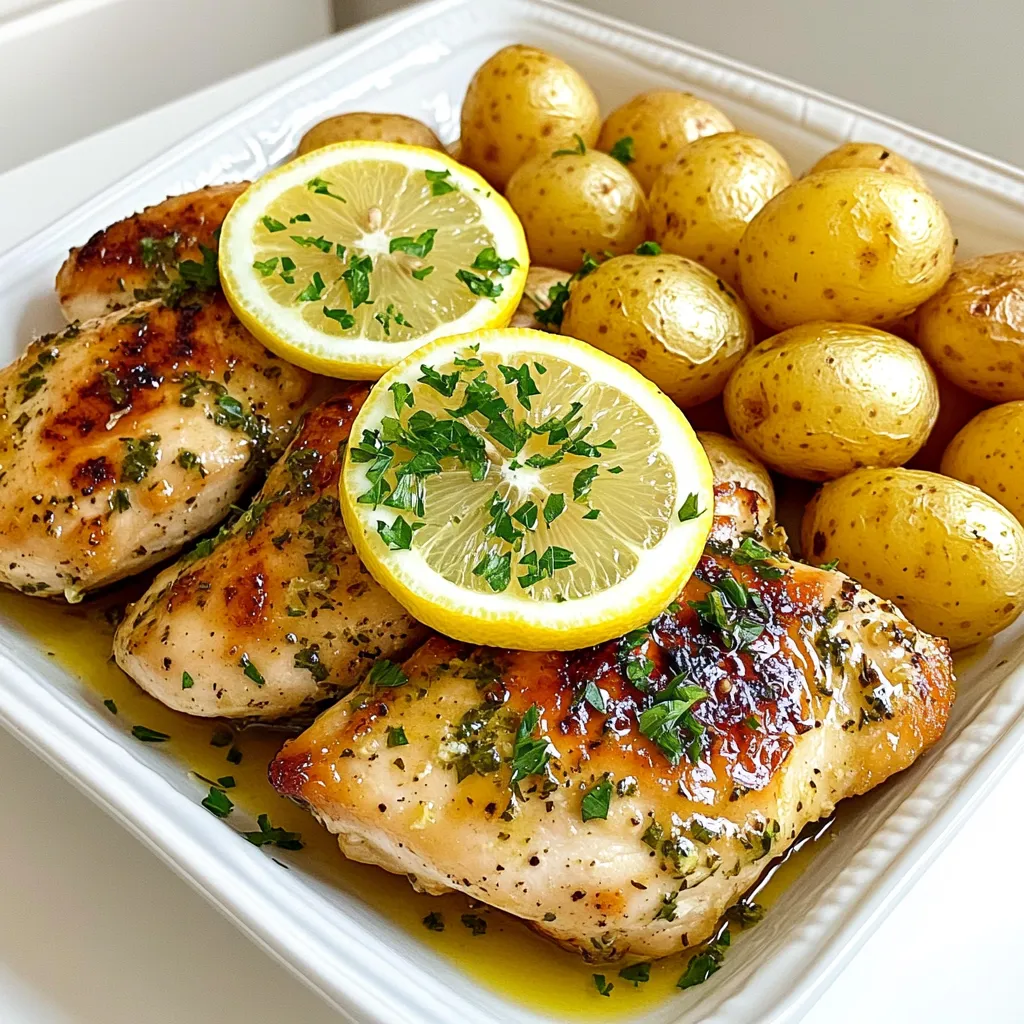 - 4 boneless, skinless chicken breasts - 1 lb baby potatoes, halved - 3 tablespoons olive oil Lemon herb chicken starts with fresh, quality ingredients. Chicken breasts provide a lean protein base. Baby potatoes add heartiness and texture. Olive oil brings moisture and flavor to the dish. - 4 cloves garlic, minced - 1 tablespoon fresh rosemary, chopped - 1 tablespoon fresh thyme, chopped - Juice and zest of 2 lemons Fresh herbs elevate the dish. Garlic adds a strong flavor. Rosemary and thyme bring earthiness. Lemon juice and zest add brightness, making each bite fresh and lively. - 1 teaspoon paprika - Salt and pepper to taste Paprika offers a subtle smokiness. Salt and pepper enhance all the other flavors. Together, these ingredients create a delicious balance in the dish. Each element works together to ensure the chicken and potatoes shine. First, preheat your oven to 400°F (200°C). This step is key for even cooking. Next, grab a large mixing bowl. In this bowl, combine three tablespoons of olive oil, the juice of one lemon, and the zest of the same lemon. Add four minced garlic cloves, one tablespoon of chopped fresh rosemary, one tablespoon of chopped fresh thyme, one teaspoon of paprika, and salt and pepper to taste. Whisk all these ingredients until they blend well. Now, take your four boneless, skinless chicken breasts and add them to the bowl. Make sure to coat them fully with the marinade. Let them sit for at least 15 minutes. This helps the chicken soak up all the great flavors. While the chicken marinates, prepare your sheet pan. Take one pound of halved baby potatoes. Spread them out on the pan. Drizzle a little olive oil over the potatoes. Then, sprinkle them with salt, pepper, and half of the leftover herb mix. Toss the potatoes so they get coated evenly. Make a space in the center of the pan for the chicken. Place the marinated chicken breasts there. Pour the rest of the marinade over the chicken. Finally, lay lemon slices on top of the chicken for extra flavor. Put the sheet pan in the preheated oven. Bake for 25-30 minutes. To check if your meal is ready, cut into the chicken. It should be white and the juices should run clear. The potatoes should also be tender and golden brown. After baking, take the pan out of the oven. Let it rest for a few minutes before serving. This waiting time allows the juices to settle. Garnish with fresh parsley for a nice touch before you dig in! For the best flavor, I recommend marinating chicken for at least 15 minutes. This short time gives the chicken a good soak in the tasty mix. If you have more time, let it sit for up to 2 hours in the fridge. This longer soak lets the flavors spread even more. To ensure an even flavor, make sure to coat each chicken breast well. Use your hands or a spoon to mix them gently in the marinade. You can also poke some small holes in the chicken. This helps the marinade seep in better. For crispy potatoes, cut them into halves or quarters. Aim for pieces about the same size, around 1 to 2 inches. This way, they cook evenly and turn golden brown. Drizzle olive oil on the potatoes before seasoning them. Use enough to coat them well but not drown them. Sprinkle salt and pepper, then toss them to spread the seasoning. You can also add some of the leftover herb mix for extra flavor. Pair this dish with a fresh green salad or some steamed veggies. The bright flavors of lemon and herbs will complement them well. You can also serve it with crusty bread to soak up the juices. For presentation, garnish the chicken and potatoes with fresh parsley. This bright green adds color and makes the dish look more appealing. You can also add lemon slices on the side for a nice touch. {{image_2}} You can use different cuts of chicken for this dish. Thighs add juicy flavor. Drumsticks offer a fun way to eat. Each cut cooks a bit differently, so check for doneness. Substituting with other meats works well, too. Try pork tenderloin or turkey. Just adjust cooking times based on the meat you choose. Adding colorful bell peppers or carrots brightens the dish. They add crunch and flavor. Chop them into bite-sized pieces for even cooking. Adjust cooking times if you add veggies. Bell peppers cook faster than potatoes. Add them halfway through baking to avoid mushiness. Trying different herbs or spices can change this recipe. Basil or oregano can offer a fresh twist. Experiment with what you love best. You can also add heat with chili flakes or hot sauce. This gives the dish a nice kick. Just start with a little, then taste and adjust. To keep your Lemon Herb Chicken and Potatoes fresh, follow these tips: - Refrigeration: Store leftovers in the fridge within two hours of cooking. - Containers: Use airtight containers to prevent moisture loss and spoilage. Glass or BPA-free plastic works well. When it’s time to enjoy your leftovers, reheating them properly is key: - Methods: Use the oven, stovetop, or microwave. The oven or stovetop will keep the chicken and potatoes crispy. - Texture and Flavor: Add a splash of olive oil or broth when reheating to keep them moist. You can freeze your dish for later enjoyment: - Cooked Dish vs. Components: Freeze the chicken and potatoes separately for best results. This helps preserve texture. - Thawing and Reheating: Thaw overnight in the fridge. Reheat in the oven at 350°F (175°C) until heated through. This keeps flavors fresh. Yes, you can use frozen chicken and potatoes. Cooking from frozen is simple. Just remember to adjust the cooking time. For frozen chicken breasts, increase the bake time by 10 to 15 minutes. Check that the chicken reaches 165°F (75°C). For frozen potatoes, they may need extra time to become tender. You can prep this dish ahead of time. Marinate the chicken and store it in the fridge for up to 24 hours. You can also chop the potatoes and mix them with oil and herbs. Store them in an airtight container. When ready, just assemble and bake. This makes weeknight dinners quic