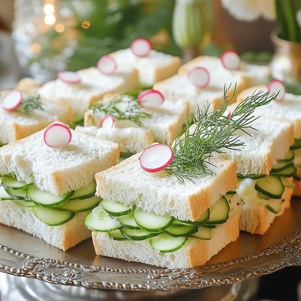 When making elegant garden tea sandwiches, you need simple and fresh ingredients. Here’s what you will need: - 8 slices of soft white bread - 4 oz cream cheese, softened - 1 small cucumber, thinly sliced - 1 small radish, thinly sliced - ½ cup alfalfa sprouts - 2 tablespoons fresh dill, chopped - 1 tablespoon fresh lemon juice - Salt and pepper to taste - 1 avocado, mashed - 1 tablespoon olive oil Each ingredient plays a key role in flavor. The soft white bread is light and easy to bite. Cream cheese adds a rich, creamy base. Fresh vegetables provide crunch and color. The cucumber and radish bring freshness, while alfalfa sprouts add a nice texture. Dill and lemon juice give a bright taste that lifts the flavors. Adding salt and pepper helps to enhance everything. The avocado offers a creamy layer, making the sandwich even better. Olive oil helps the avocado spread more easily. You can also add optional ingredients to mix things up. Try using different herbs, spreads, or cheeses. You can even swap the vegetables for what you have on hand. The key is to keep it fresh and simple, so every bite is delicious. - Laying out the bread Start by laying out 8 slices of soft white bread on a clean surface. Use a cutting board or a plate. Make sure they are flat and ready for filling. - Mixing the cream cheese filling In a bowl, take 4 oz of softened cream cheese. Add 2 tablespoons of fresh dill, 1 tablespoon of lemon juice, salt, and pepper. Mix it well until it is smooth and creamy. This filling adds a fresh taste to your sandwiches. - Assembling the sandwiches Spread an even layer of the cream cheese mixture on 4 slices of bread. Layer thinly sliced cucumbers, alfalfa sprouts, and radish slices on top. Take the remaining slices and spread mashed avocado mixed with 1 tablespoon of olive oil. Place these on top of the veggie layers to form sandwiches. - Trimming and cutting Use a sharp knife to trim the crusts off the sandwiches. This gives them a neat look. You can cut the sandwiches into quarters, triangles, or fingers. Arrange them neatly on a platter. Cover with plastic wrap and refrigerate for at least 2 hours or overnight. This helps the flavors blend well. To make the best tea sandwiches, start with the cream cheese. Use softened cream cheese for easy spreading. If your cream cheese is too firm, it can tear the bread. Mix in fresh dill and lemon juice to add flavor. The salt and pepper will enhance the taste. Next, slice the vegetables thinly. Use a sharp knife for clean cuts. Thin slices of cucumber and radish look nice and taste great. Aim for uniform shapes to keep the look tidy. You can also use a mandoline for even slices if you have one. For a neat presentation, trim the crusts off the sandwiches. This gives a clean look and makes them easy to eat. Cut the sandwiches into quarters, triangles, or fingers. Arrange them on a pretty platter. Garnish with a sprig of dill or extra radish slices for color. This adds a lovely touch to your tea sandwiches and makes them picture-perfect. {{image_2}} You can make tea sandwiches your own with fun fillings. Start by trying different spreads and cheeses. Cream cheese works well, but you can also use goat cheese or hummus. These add a different taste and texture. Next, think about creative vegetable combinations. You could add sliced bell peppers, grated carrots, or even roasted beets. These add color and crunch. You can mix and match vegetables based on what you like. Seasonal ingredients can also bring freshness to your sandwiches. In summer, use ripe tomatoes and basil. In fall, try apple slices with a bit of sharp cheese. Each season gives new flavors to explore. By switching out spreads, veggies, and seasonal items, you keep your tea sandwiches exciting and tasty! To keep your tea sandwiches fresh, follow these simple tips. Refrigeration Guidelines Store your tea sandwiches in the fridge. They taste best when chilled. Use plastic wrap or a container. Wrap each sandwich tightly. This keeps them moist and flavorful. Try to eat them within 24 hours for the best taste. Freezing Tips You can also freeze tea sandwiches. Wrap them well in plastic wrap. Then, place them in a freezer bag. They can last up to a month in the freezer. When you want to eat them, thaw in the fridge overnight. Avoid microwaving them, as this can make the bread soggy. Best Containers for Storage Choose airtight containers for storing your sandwiches. A shallow container works best. This helps keep their shape. If you stack them, add parchment paper between layers. This helps prevent sticking and keeps them looking nice. You can make tea sandwiches up to 24 hours ahead. This time lets flavors mix well. Just keep them covered in the fridge. If you make them too early, the bread may get soggy. Yes, you can use whole grain bread. It adds a nice nutty taste and extra fiber. Just make sure the bread is soft enough to spread the cream cheese easily. The best flavors for tea sandwiches are fresh and light. Some great choices include: - Cucumber and cream cheese - Avocado and lemon - Radish with fresh herbs - Hummus and roasted veggies These flavors work well together and make for tasty bites. This blog post covered how to make delicious tea sandwiches. We talked about the best ingredients, from soft white bread to fresh veggies. You learned how to prepare and assemble them step by step. We shared tips for making your sandwiches neat and tasty. You also discovered different variations and how to store them. Overall, making tea sandwiches is fun and easy. With practice, you can impress your friends and family. Enjoy creating your unique flavors!