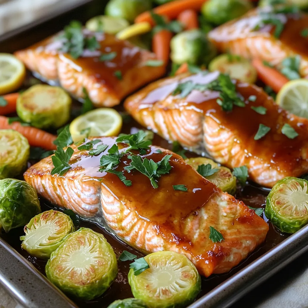 1. Roast everything in the preheated oven for about 15-20 minutes. Check if the salmon is cooked through and the veggies are tender. Halfway through cooking, baste the salmon with additional glaze for extra flavor.