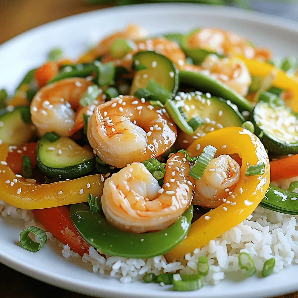 Each ingredient plays a key role in this dish. The large shrimp bring a sweet and tender bite. Olive oil helps cook everything smoothly. Garlic and ginger add a warm, aromatic flavor. Bell pepper, snap peas, and zucchini provide bright colors and crunch.