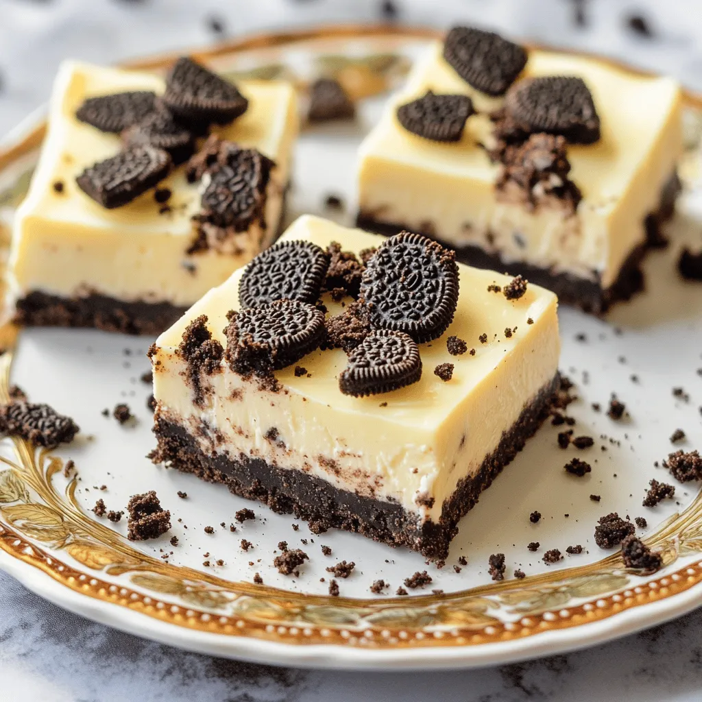 The main star of these bars is the Oreo cookies. You will need 24 crushed cookies for the crust. These cookies add a rich chocolate flavor. They also provide a crunchy texture that balances the creamy filling. For the crust, mix the crushed cookies with melted butter. The butter helps the crust hold together.