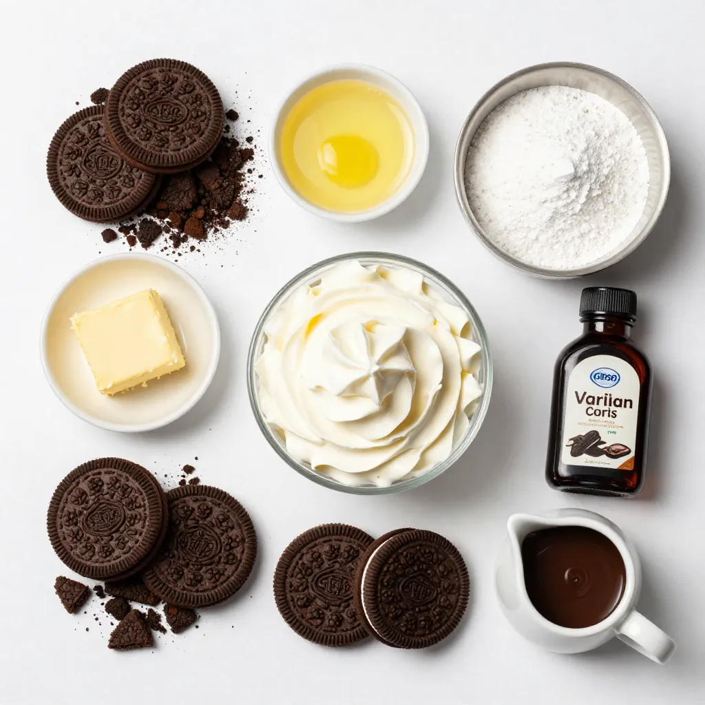 Oreo cookies form the base and give great flavor. We crush them to make a tasty crust. The butter helps hold the crust together. Cream cheese is the star of our filling. It adds smoothness and richness. Powdered sugar sweetens the filling without grittiness. Vanilla extract adds a warm, sweet note. Heavy whipping cream makes the cheesecake light and fluffy. Chopped Oreo cookies on top add crunch and more chocolate flavor.