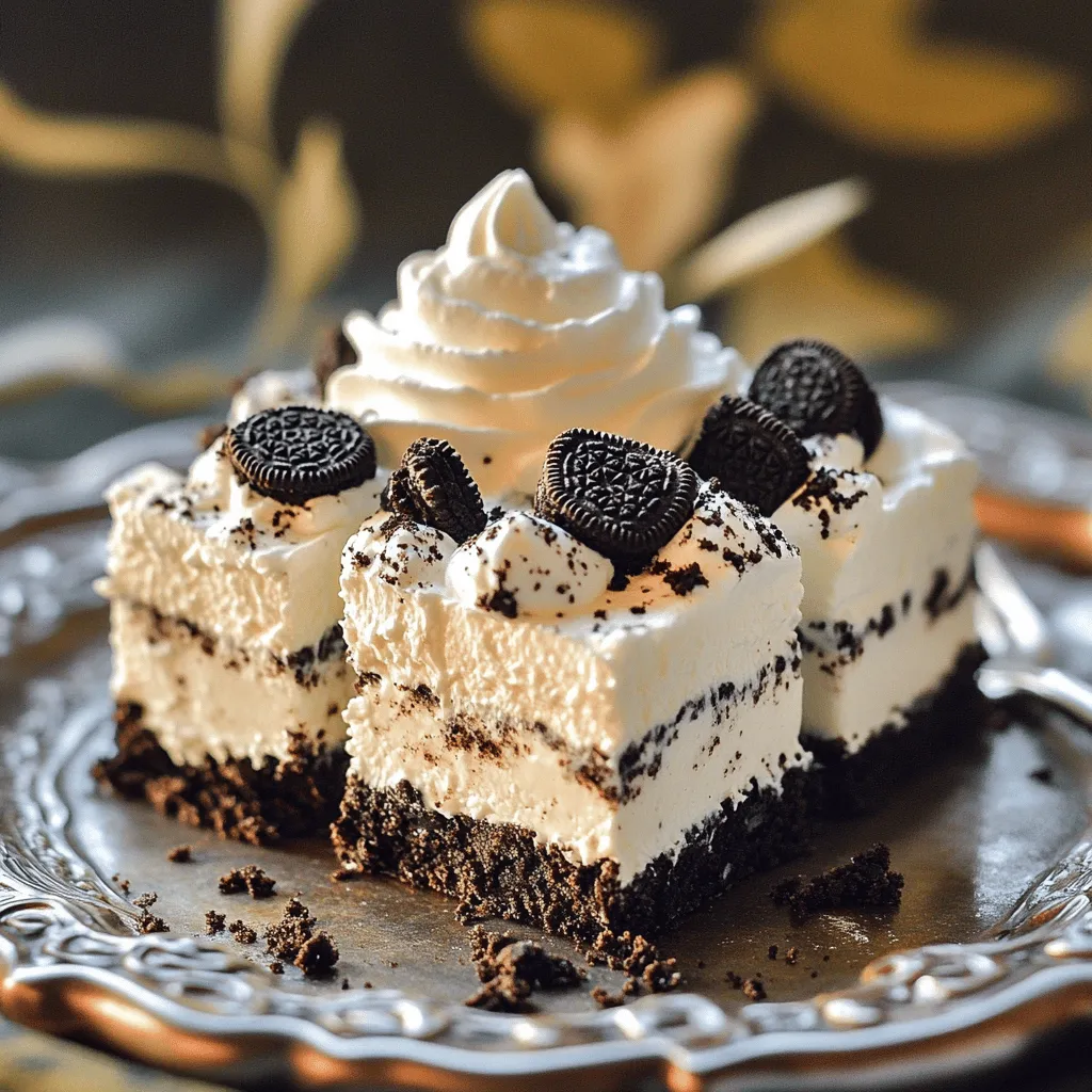 For a beautiful dessert, slice the bars neatly and place them on a nice platter. A sprinkle of crushed Oreo crumbs on top adds a nice touch. You can also add a dollop of whipped cream on the side. This makes each serving look special and inviting!