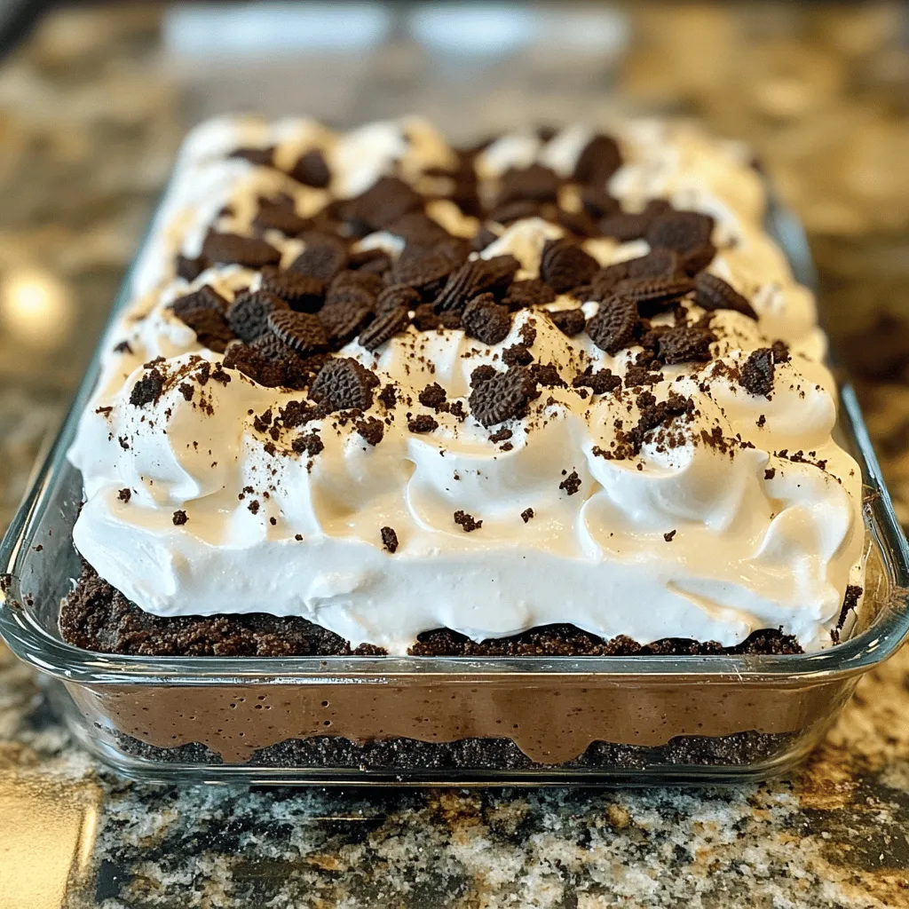 - 24 Oreo cookies, crushed - 1/2 cup unsalted butter, melted - 1 (8 oz) package cream cheese, softened - 1/2 cup powdered sugar - 1 tsp vanilla extract - 1 cup whipped cream (or Cool Whip) - 1 cup chocolate pudding mix - 2 cups milk - Extra crushed Oreos for topping This No-Bake Oreo Delight is a simple dessert that everyone loves. To make it, you will need some key ingredients that create rich flavors and creamy textures. First, grab 24 Oreo cookies. These give our dessert its signature taste. Crush them into fine pieces to form the base of our treat. Next, you need 1/2 cup of unsalted butter. This will help bind the crushed Oreos together. You will also need 1 (8 oz) package of softened cream cheese. This adds a creamy layer that balances the sweetness. Mix in 1/2 cup of powdered sugar for a touch of sweetness. A teaspoon of vanilla extract will enhance the flavor. For that light and fluffy texture, use 1 cup of whipped cream or Cool Whip. You’ll also need 1 cup of chocolate pudding mix mixed with 2 cups of milk. This creates a rich pudding layer on top. Lastly, keep some extra crushed Oreos for topping. They add a nice crunch. With these ingredients, you can create a delightful dessert that’s perfect for any occasion. - First, crush 24 Oreo cookies in a bowl. You can use a rolling pin or a food processor. - Next, melt 1/2 cup of unsalted butter in the microwave. - Combine the crushed cookies and melted butter. Stir until it looks like wet sand. - Now, press this mixture firmly into the bottom of a 9x9 inch baking dish. Make sure it's even. - Take 8 oz of softened cream cheese and beat it in a bowl until smooth. - Gradually mix in 1/2 cup of powdered sugar and 1 tsp of vanilla extract. Stir until well combined. - Fold in 1 cup of whipped cream gently. This makes the layer light and fluffy. - Spread this cream cheese mix evenly over the crust in the baking dish. - Prepare 1 cup of chocolate pudding mix by following the package instructions. Use 2 cups of milk. - Allow the pudding to thicken for a few minutes. - Once it's ready, pour the pudding over the cream cheese layer. Spread it evenly with a spatula. - For a fun touch, sprinkle extra crushed Oreos on top of the pudding layer. This adds crunch and looks great! - Finally, cover the dish with plastic wrap. Refrigerate for at least 4 hours. This helps it set completely. - After chilling, cut into squares and serve it chilled. Enjoy your No-Bake Oreo Delight! To get the best creamy texture, make sure to soften the cream cheese first. This helps it mix smoothly into the dessert. When you fold in the whipped cream, do it gently. This keeps the light and airy texture intact. This dessert shines at parties and gatherings. It’s easy to serve and loved by all. Always serve it chilled for the best taste. This makes every bite refreshing and delightful. You can make this dessert even more fun! Try adding chocolate chips or nuts for extra crunch. If you want to switch things up, swap Oreo cookies for other cookie varieties. You can use chocolate chip cookies or even peanut butter cookies. {{image_2}} You can change up the flavor of your No-Bake Oreo Delight by using different types of Oreos. Here are two tasty options: - Mint Oreo version: Mint Oreos add a fresh twist. They give a cool flavor that mixes well with cream cheese. Just swap regular Oreos for Mint Oreos in the crust and topping. - Peanut Butter Oreo twist: Peanut Butter Oreos bring a rich, nutty taste. Use them in place of regular Oreos for a fun change. The creamy peanut butter flavor pairs nicely with the other layers. If you want a dairy-free version, you can still enjoy this dessert! Here's how: - Substitute regular cream cheese with dairy-free cream cheese. This keeps the creamy texture. - Use dairy-free whipped topping instead of regular whipped cream. This makes it light and fluffy. For those who need a gluten-free dessert, this recipe can easily adapt: - Use gluten-free Oreo cookies instead of regular ones. They taste just as good! This way, everyone can enjoy this treat without allergies. You can keep No-Bake Oreo Delight in the fridge for up to five days. Make sure to cover it well with plastic wrap or a lid. This helps keep it fresh and tasty. The cool air in the fridge will help the layers stay firm. If you want to freeze the dessert, slice it into squares first. Wrap each piece tightly in plastic wrap. Then, place them in an airtight container. This helps avoid freezer burn. You can freeze it for up to two months. To thaw, just place it in the fridge overnight before serving. When you’re ready to serve, take it out of the fridge or freezer. Let it sit at room temperature for about 10 minutes. This makes it easier to cut and eat. For the best taste, serve it chilled. Don't forget to add extra crushed Oreos on top for a fun crunch! To make No-Bake Oreo Delight, start by crushing 24 Oreo cookies. Mix these with 1/2 cup of melted unsalted butter until it looks like wet sand. Press this mixture into a 9x9 inch baking dish. This forms your crust. In another bowl, beat 1 package of softened cream cheese. Add 1/2 cup of powdered sugar and 1 tsp of vanilla extract to it. Mix until smooth. Fold in 1 cup of whipped cream. Spread this onto the crust. Next, prepare 1 cup of chocolate pudding mix with 2 cups of milk. Once thick, pour the pudding over the cream cheese layer. Finish by topping with extra crushed Oreos. Cover and chill for at least 4 hours before serving. Yes, you can use other cookies! Try chocolate chip cookies for a twist. Vanilla wafers give a light taste. Peanut butter cookies add a rich flavor. Any cookie you like can work. Just crush them and replace the Oreos in the crust. This keeps the fun and taste of the dessert. The dessert takes about 4 hours to chill. This time allows it to firm up nicely. Factors that can affect setting include your fridge's temperature and how thick your layers are. A colder fridge can speed up the setting time. Always check befo