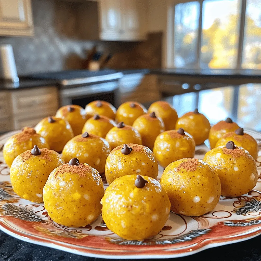 When serving, place the energy bites on a pretty plate. You can even sprinkle some extra pumpkin spice on top. This gives a nice look and adds more flavor. For a touch of fun, add a few mini chocolate chips on each bite. It makes them look tempting!