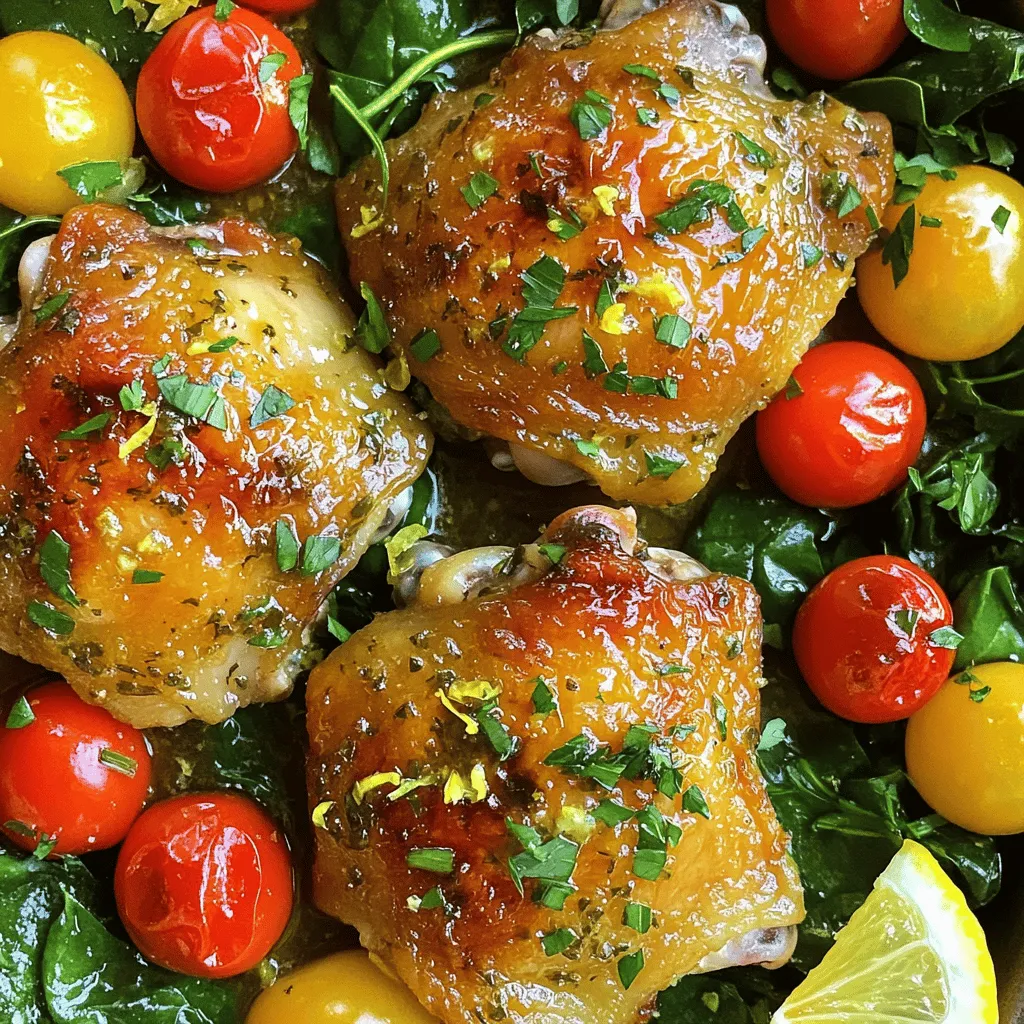 - 4 chicken thighs, bone-in and skin-on - 2 tablespoons olive oil - 1 lemon (zested and juiced) - 4 cloves garlic, minced - 1 teaspoon dried oregano - 1 teaspoon fresh thyme, chopped (or ½ teaspoon dried thyme) - 1 teaspoon rosemary, chopped - Salt and pepper to taste - 1 cup low-sodium chicken broth - 2 cups baby spinach - 1 cup cherry tomatoes, halved - Fresh parsley, chopped (for garnish) Using these simple ingredients, you can create a dish that is packed with flavor. The chicken thighs are the star of the show. They stay juicy and tender, and the skin becomes crispy. The lemon adds brightness, while garlic gives depth. The herbs bring a fresh taste that brightens each bite. With chicken broth, we add a rich base. Spinach and tomatoes add color and nutrients. Plus, they soak up all the tasty juices. Fresh parsley on top gives an appealing finish. Each ingredient plays its part to make this dish truly delightful. 1. Preheating the oven Start by preheating your oven to 400°F (200°C). This step warms the oven, so your chicken cooks evenly. 2. Making the marinade In a large bowl, mix together: - 2 tablespoons olive oil - Zest from 1 lemon - Juice from 1 lemon - 4 cloves garlic, minced - 1 teaspoon dried oregano - 1 teaspoon fresh thyme (or ½ teaspoon dried thyme) - 1 teaspoon rosemary, chopped - Salt and pepper to taste This mix will give your chicken a bright, fresh flavor. 3. Marinating the chicken thighs Add 4 bone-in, skin-on chicken thighs to the bowl. Make sure to coat them well with the marinade. Let them sit for at least 15 minutes. For deeper flavor, you can marinate them in the fridge for up to 2 hours. 1. Searing the chicken thighs Heat a bit of olive oil in a large oven-safe skillet over medium heat. Once hot, place the chicken thighs skin-side down. Sear them for about 5-6 minutes. You want the skin to turn golden brown and crispy. 2. Adding broth and vegetables Carefully flip the chicken thighs over. Pour in 1 cup of low-sodium chicken broth. This adds moisture and flavor. Bring the broth to a simmer, scraping any brown bits from the bottom of the pan. 3. Baking in the oven Add 2 cups of baby spinach and 1 cup of halved cherry tomatoes around the chicken in the skillet. Transfer the skillet to your preheated oven. Bake for 25-30 minutes. The chicken should reach an internal temperature of 165°F (75°C) when done. 1. Resting the chicken Once the chicken is cooked, remove it from the oven. Let it rest for a few minutes. This helps the juices settle, making the chicken juicier. 2. Garnishing and serving suggestions Garnish your dish with fresh parsley. Serve the chicken on a large platter. Spoon the broth and vegetables over the chicken. You can also add lemon wedges for a bit of extra zing. - For the best flavor, marinate the chicken thighs for at least 15 minutes. - You can marinate them for up to 2 hours in the fridge for a deeper taste. - Add a splash of white wine or a teaspoon of honey for extra flavor. - To get crispy skin, sear the chicken thighs skin-side down for 5-6 minutes. - Make sure the heat is medium; too high can burn the skin. - Check doneness by using a meat thermometer; it should reach 165°F (75°C). - Serve the chicken on a large platter. Spoon the broth and veggies on top. - Add lemon wedges on the side for a fresh look and extra zest. - Sprinkle fresh parsley over the dish for a pop of color. {{image_2}} You can swap chicken thighs for chicken breasts. Breasts cook faster and are leaner. Just check the cooking time, as they need less time in the oven. You can also use pork or fish. Pork tenderloin pairs well with the lemon and herbs. For fish, try salmon or tilapia. Both will soak up the flavors nicely. Feel free to mix in seasonal vegetables. Carrots, bell peppers, or zucchini add color and taste. You can also use green beans or asparagus for a crunchy side. For a vegetarian option, replace the chicken with hearty veggies like eggplant or mushrooms. Tofu is a great protein choice that absorbs the marinade well. Experiment with different herbs and spices. Basil or parsley can brighten the dish. For a spicy kick, add red pepper flakes. You can also try using different citrus fruits. Lime or orange zest gives a fun twist to the marinade. These swaps make the dish new each time you cook it. Store your One-Pan Lemon Herb Chicken Thighs in an airtight container. This keeps them fresh. You can keep the dish in the fridge for up to 3 days. Make sure to let it cool before sealing. To freeze the chicken, let it cool completely. Place it in a freezer-safe bag or container. Try to remove as much air as possible to avoid freezer burn. You can freeze it for up to 3 months. For thawing, move it to the fridge overnight. If you need it fast, you can use the microwave. Just be sure to use the defrost setting. The best way to reheat is on the stove. Place the chicken in a skillet over medium heat. Add a splash of broth or water to keep it moist. Cover the skillet to heat evenly. You can also use the oven. Preheat it to 350°F (175°C). Place the chicken on a baking sheet covered with foil. This helps keep the chicken juicy. Reheat for about 15-20 minutes. To maintain texture and flavor, avoid high heat. This keeps the chicken tender and delicious. It takes about 25-30 minutes to cook chicken thighs in the oven at 400°F. You want the internal temperature to reach 165°F. This ensures the chicken is safe to eat and juicy. Yes, you can use boneless chicken thighs. They will cook faster, so check them after about 20 minutes. The flavors will still shine through. I love serving this dish with a side of rice or couscous. You can also add a fresh salad or some roasted veggies. They balance well with the chicken's flavors. Yes, you can marinate the chicken a few hours or even a day ahead. Just keep it in the fridge until you are ready to cook. This helps the flavors develop even more. If your chicken thighs are not crispy, make sure to sear them well in the pan. Use medium