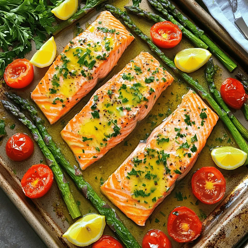 1. Arranging salmon and vegetables on the baking sheet: Take a large rimmed baking sheet and place the 4 salmon fillets in the center. Pour half of your marinade over the fillets. Make sure each piece is well coated. Next, add 1 cup of halved cherry tomatoes and 1 cup of trimmed asparagus around the salmon. Drizzle the rest of the marinade over the veggies and toss them gently to coat.