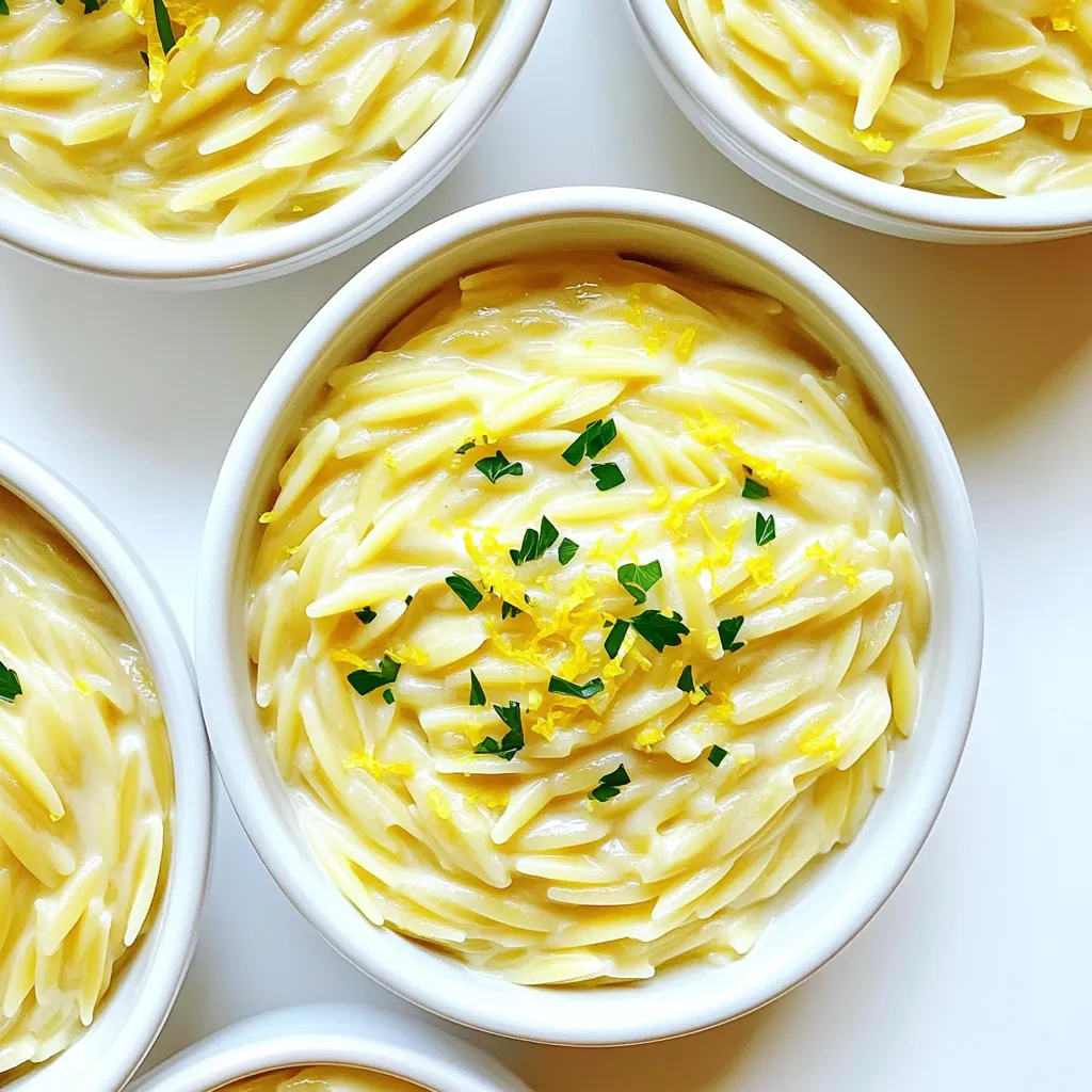 - 1 cup orzo pasta - 3 cups vegetable broth - 1 cup heavy cream - 1 cup freshly grated Parmesan cheese - 1 tablespoon olive oil - 2 cloves garlic, minced - 1 teaspoon lemon zest - 2 tablespoons fresh lemon juice - 1/2 teaspoon black pepper - 1/4 teaspoon salt - 1/4 cup fresh parsley, chopped (for garnish) - Large pot - Wooden spoon - Measuring cups and spoons When making One-Pot Creamy Lemon Parmesan Orzo, you need a few key ingredients. First, orzo pasta is the star. It's small and cooks quickly. Next, vegetable broth adds flavor. Heavy cream makes it rich and creamy. Freshly grated Parmesan cheese gives it a nice cheesy touch. For seasonings, olive oil adds a little fat. Minced garlic brings in a warm aroma. Lemon zest and juice brighten the dish with fresh flavor. Black pepper and salt balance everything out. Fresh parsley is perfect for garnish and adds color. To cook this dish, you need a large pot. A wooden spoon helps stir the ingredients. Measuring cups and spoons make it easy to get the right amounts. With these ingredients and tools, you are ready to create a delightful meal that everyone will love. 1. Heat 1 tablespoon of olive oil in a large pot over medium heat. 2. Add 2 cloves of minced garlic and sauté for about 1 minute. You want it fragrant but not burnt. 3. Stir in 1 cup of orzo pasta and toast it for 2-3 minutes. Keep stirring often to avoid sticking. 1. Pour in 3 cups of vegetable broth and bring it to a boil. 2. Once boiling, reduce the heat to low and cover the pot. 3. Let the orzo simmer for about 10-12 minutes. Stir occasionally until the pasta is al dente and most broth is absorbed. 1. Remove the pot from heat when the orzo is cooked. 2. Stir in 1 cup of heavy cream, 1 cup of freshly grated Parmesan cheese, 1 teaspoon of lemon zest, and 2 tablespoons of lemon juice. Mix until the cheese melts and the dish is creamy. 3. Add 1/2 teaspoon of black pepper and 1/4 teaspoon of salt. Taste and adjust seasoning if needed. 4. Serve warm, garnished with 1/4 cup of chopped fresh parsley for a bright finish. To achieve the best creaminess in your orzo, consider adding extra heavy cream. This will make the dish richer. Stirring the mixture well helps blend the flavors. Use a gentle motion to avoid breaking the orzo. You can boost the flavor with herbs and spices. Try adding fresh thyme or basil for a twist. If you want to swap out Parmesan, use Pecorino Romano. It adds a sharp taste that works well in this dish. Pair this dish with grilled chicken or a fresh salad. It complements these sides perfectly. For a restaurant-style look, serve in shallow bowls. Add a sprinkle of extra Parmesan and a lemon slice on top for a beautiful finish. {{image_2}} You can make this dish lighter by swapping out heavy cream. Use Greek yogurt or cashew cream instead. These options add creaminess with less fat. You can also switch to whole grain or gluten-free orzo. Whole grain adds more fiber while gluten-free fits many diets. Want to boost the dish? Add protein like chicken or shrimp. Cooked chicken adds heartiness, while shrimp brings a sweet flavor. For veggies, stir in spinach or peas. Spinach wilts down nicely, adding color and nutrients. Peas provide a sweet pop, enhancing the dish's taste. Seasonal herbs and citrus can bring fresh flavors. In spring, try adding fresh basil or dill. In summer, use zesty lemon or lime. These ingredients brighten the orzo and make it perfect for warm weather. This way, you enjoy a new taste each season. To store leftovers in the fridge, place the orzo in an airtight container. This keeps it fresh and prevents drying. It is best to let the orzo cool before sealing it. To keep the orzo creamy, stir in a bit of extra heavy cream. This helps keep it moist for later. Store in the fridge for up to three days. To freeze this dish, let it cool completely first. Then, use freezer-safe bags or containers for storage. Make sure to remove as much air as possible to avoid freezer burn. When you're ready to eat, thaw it in the fridge overnight. Reheat in a pot over low heat. Add a splash of vegetable broth or cream to help it regain its creamy texture. In the fridge, One-Pot Creamy Lemon Parmesan Orzo lasts about three days. In the freezer, it can stay good for up to three months. Just remember, the longer it sits, the more the texture may change. Enjoy it fresh whenever possible for the best flavor! Yes, you can make this dish ahead of time. Cook the orzo and let it cool. Store it in an airtight container in the fridge for up to three days. When ready to eat, reheat it gently on the stove. Add a splash of cream to keep it creamy. If you need a substitute for Parmesan cheese, try Pecorino Romano. It has a sharp taste similar to Parmesan. Nutritional yeast is a great dairy-free option too. It gives a cheesy flavor and is packed with nutrients. Yes, you can make a vegan version. Use cashew cream or coconut cream instead of heavy cream. Replace Parmesan with nutritional yeast or a vegan cheese blend. This keeps the creamy texture while being plant-based. The orzo is done when it is al dente, which means it should have a slight bite. This usually takes about 10-12 minutes of cooking. Taste a piece to check its doneness before you finish the dish. Absolutely! Chicken broth will add a rich flavor to the orzo. Just make sure it fits your dietary needs. Both broths work well, so use what you have on hand. This article guides you on making a creamy lemon Parmesan orzo. You learned about key ingredients, cooking steps, and ways to enhance flavor. I shared tips for perfecting creaminess and suggested variations for different tastes. Remember to store leftovers properly for the best taste. Experiment with seasonal ingredients to keep your dish exciting. Enjoy creating this comforting meal that fits any occasion!