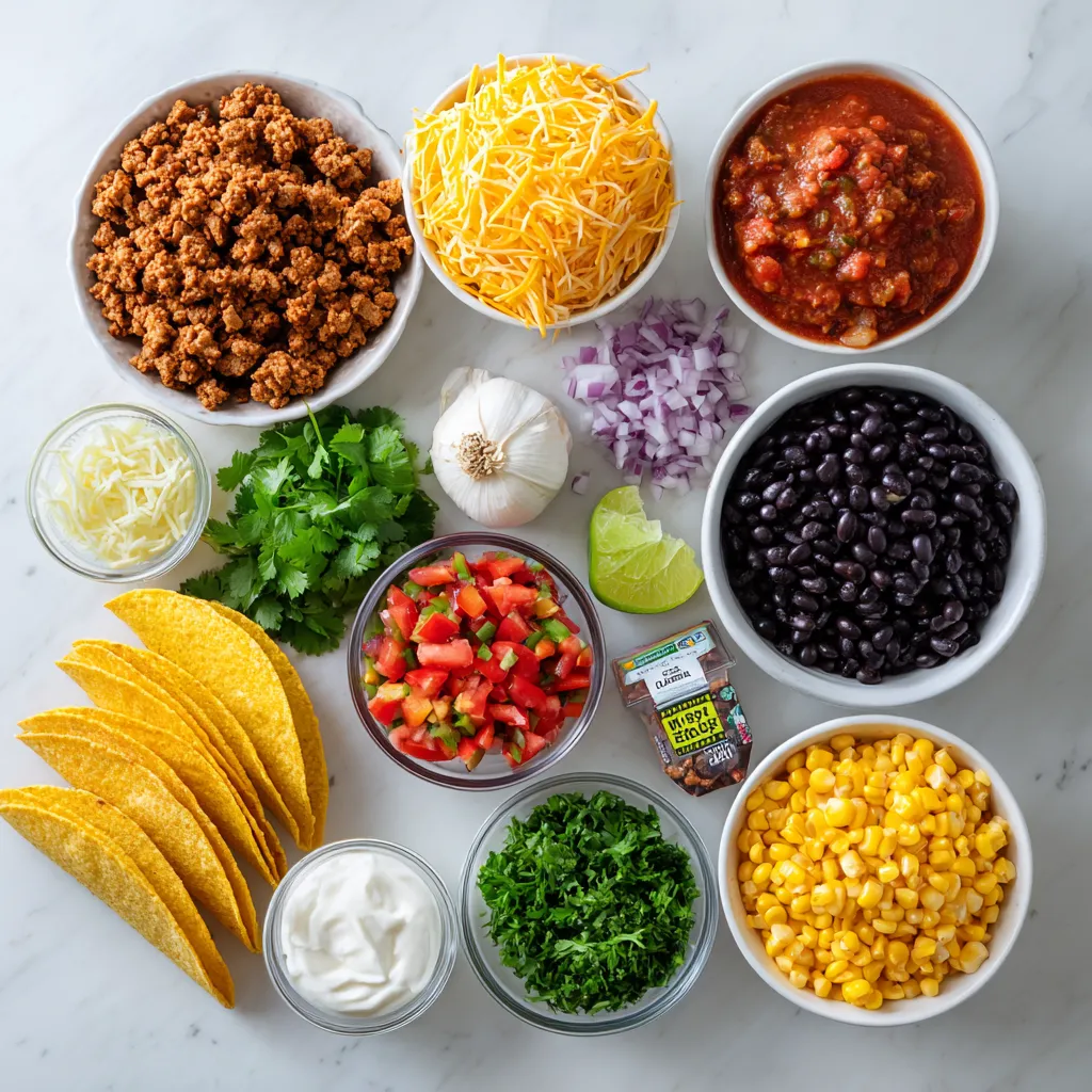 Gathering these ingredients is simple. You can find them at any grocery store. The taco shells serve as a base for your filling. Ground turkey or beef adds protein and flavor. Diced onion and minced garlic give a nice aroma. Taco seasoning brings that classic taste. Black beans and corn add texture and nutrients. Shredded cheddar cheese melts perfectly on top. Diced tomatoes and cilantro enhance the flavor. Finally, sour cream and salsa make great toppings. These ingredients come together to create a fun and tasty meal.