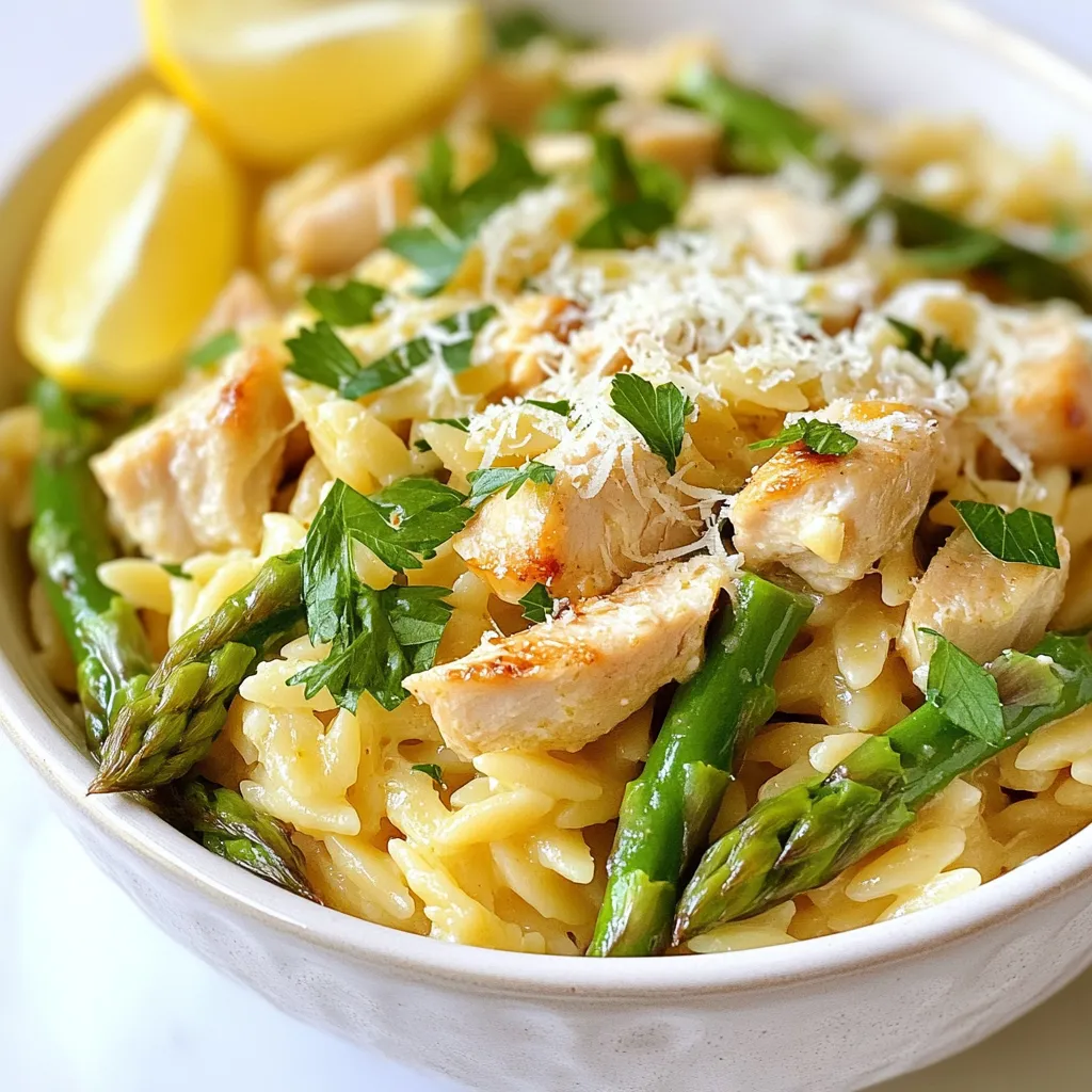 To make Parmesan Orzo with Chicken and Asparagus, gather these ingredients: - 1 cup orzo pasta - 2 chicken breasts, diced - 1 bunch asparagus, trimmed and cut into 1-inch pieces - 1 small onion, finely chopped - 2 cloves garlic, minced - 1 cup chicken broth - 1 cup heavy cream - 1 cup grated Parmesan cheese - 2 tablespoons olive oil - Salt and pepper to taste - Fresh parsley, chopped for garnish Each ingredient plays a key role in the dish. Here are some tips: - Orzo Pasta: You can swap it for any small pasta like ditalini or couscous. - Chicken Breasts: You can use thighs for more flavor or rotisserie chicken for quick prep. - Asparagus: If it's out of season, green beans or broccoli can work well. - Chicken Broth: Use vegetable broth for a lighter taste or homemade broth for depth. - Heavy Cream: For a lighter version, try half-and-half or coconut cream. Garnishes add flair and flavor. Consider these options: - Chopped fresh parsley for a pop of color. - Extra grated Parmesan on top for a rich finish. - Lemon wedges for a bright, zesty touch. {{ingredient_image_1}} Start by boiling water in a medium saucepan. Add salt to the water. Once it boils, add 1 cup of orzo pasta. Cook it for about 8-10 minutes. You want it al dente. Drain the orzo and put it aside for later. Next, heat 2 tablespoons of olive oil in a large skillet over medium heat. Add 2 diced chicken breasts to the skillet. Season with salt and pepper. Cook for 5-7 minutes. Make sure the chicken is browned and fully cooked. Once done, remove it from the skillet and set it aside. In the same skillet, add 1 finely chopped onion and 1 bunch of asparagus, cut into 1-inch pieces. Cook these for 3-4 minutes. The onion should be translucent, and the asparagus should be tender-crisp. Next, add 2 minced garlic cloves and cook for another 1-2 minutes until it smells great. Pour in 1 cup of chicken broth and 1 cup of heavy cream. Stir the mixture well and let it simmer on low heat for about 3-5 minutes. This will help the sauce get a bit thicker. After that, stir in the cooked orzo, the cooked chicken, and 1 cup of grated Parmesan cheese. Mix everything together and let it cook on low heat for 2-3 minutes, until all is hot and creamy. Taste it and add more salt or pepper if you want. When ready to serve, remove the skillet from the heat. Garnish your dish with chopped parsley. Serve it in shallow bowls. For extra flavor, add a sprinkle of Parmesan cheese on top and a side of lemon wedges. Enjoy your meal! To make Parmesan orzo creamier, use heavy cream. This rich ingredient gives the dish a smooth texture. You can also add more Parmesan cheese. Stir in extra cheese at the end for an even creamier finish. If you want a lighter touch, use half-and-half instead of heavy cream. This will still keep the dish rich without being too heavy. Cook the chicken in a hot skillet with olive oil. This helps it brown nicely. Make sure to season it well with salt and pepper. Cook it for about 5-7 minutes. Cut the chicken into small pieces to ensure even cooking. If you notice any pink, cook it a bit longer. Juicy chicken makes the dish much tastier. Cook the asparagus just right. Sauté it for about 3-4 minutes. You want it to be bright green and tender but still have a slight crunch. To check, taste a piece while cooking. If it is too soft, you've cooked it too long. For extra flavor, add garlic after the asparagus cooks. This enhances the taste without losing its texture. Pro Tips Use Fresh Asparagus: Fresh asparagus not only adds vibrant color but also a crisp texture to the dish. Look for bright green stalks that are firm and straight for the best flavor. Cook Orzo Al Dente: Ensure the orzo is cooked al dente for the best texture. It will continue to absorb moisture when mixed with the sauce, so slightly undercooking it will prevent it from becoming mushy. Adjust Creaminess: If you prefer a creamier dish, feel free to add more heavy cream or Parmesan cheese. This will enhance the richness and flavor of the sauce. Garnish with Lemon: A squeeze of fresh lemon juice just before serving can brighten the flavors in this dish. Serve with lemon wedges on the side for an extra zing! {{image_2}} You can swap out vegetables in this dish. Try using peas, spinach, or bell peppers. Each veggie brings a new taste. For a fun twist, add cherry tomatoes for a burst of flavor. You can also use frozen asparagus if fresh ones are not available. They work well too, saving time in prep. Want to mix it up? You can add different proteins. Shrimp is a great choice. It cooks quickly and adds a nice touch. Tofu is another option. Just toss in cubed, firm tofu for a vegetarian version. You could also use leftover rotisserie chicken. It will save time and add flavor to your dish. To make this dish vegan, swap out key ingredients. Use vegetable broth instead of chicken broth. Replace heavy cream with coconut cream or a plant-based cream. For cheese, use a vegan Parmesan or nutritional yeast for that cheesy taste. These changes keep the dish creamy and delightful without animal products. To keep your Parmesan orzo fresh, let it cool first. Once cool, place it in an airtight container. This helps keep moisture in and prevents the pasta from drying out. Store it in the fridge for up to three days. If you notice excess moisture, use a paper towel to absorb it before sealing. When you're ready to enjoy your leftovers, reheat them gently. I recommend using a skillet over low heat. Add a splash of chicken broth or cream to keep it creamy. Stir often until heated through. You can also use the microwave, but cover it with a damp paper towel to avoid drying out. Heat in short bursts, stirring in between. You can freeze this dish for later. Start by letting it cool completely. Transfer it to a freezer-safe container or bag. Be sure to label it with the date. This dish can last for up to three months in the freezer. To reheat, thaw it overnight in the fridge. Then, follow the reheating tips 