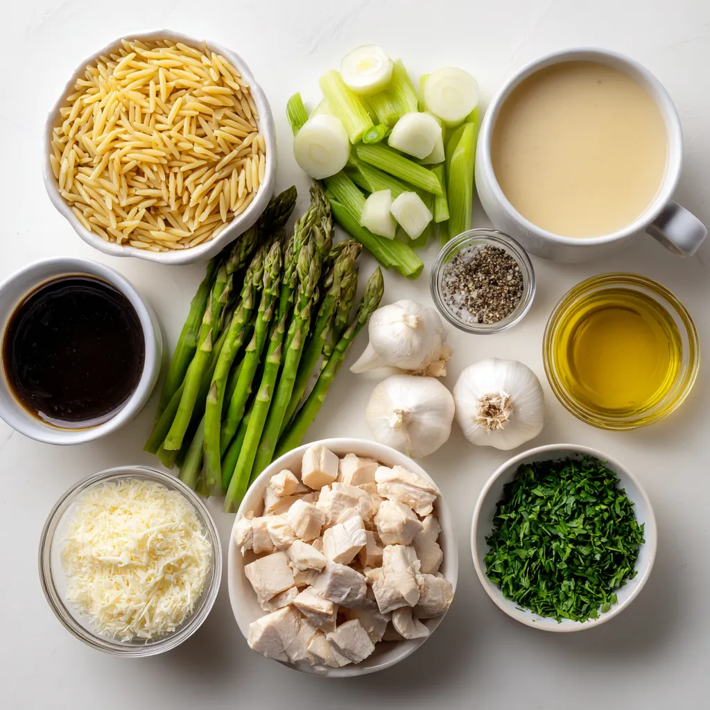 To make Parmesan Orzo with Chicken and Asparagus, gather these ingredients: