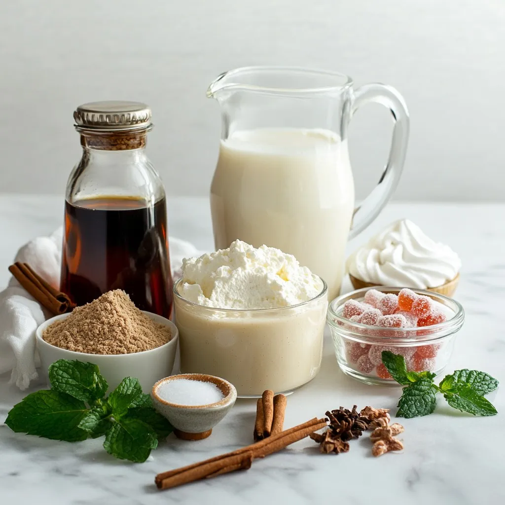 To start, gather your ingredients. You need eggnog, heavy cream, and peppermint syrup. Don’t forget the vanilla extract, nutmeg, and cinnamon. Make sure you have chilled club soda too.