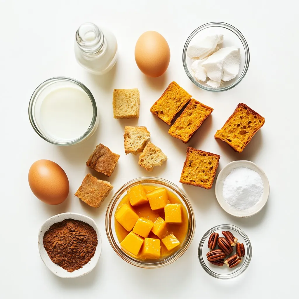 To start, gather your ingredients. You need day-old bread, pumpkin puree, eggs, milk, cream, and spices. Cut the bread into cubes. For this recipe, I love using Brioche or Challah. They add great flavor and texture.